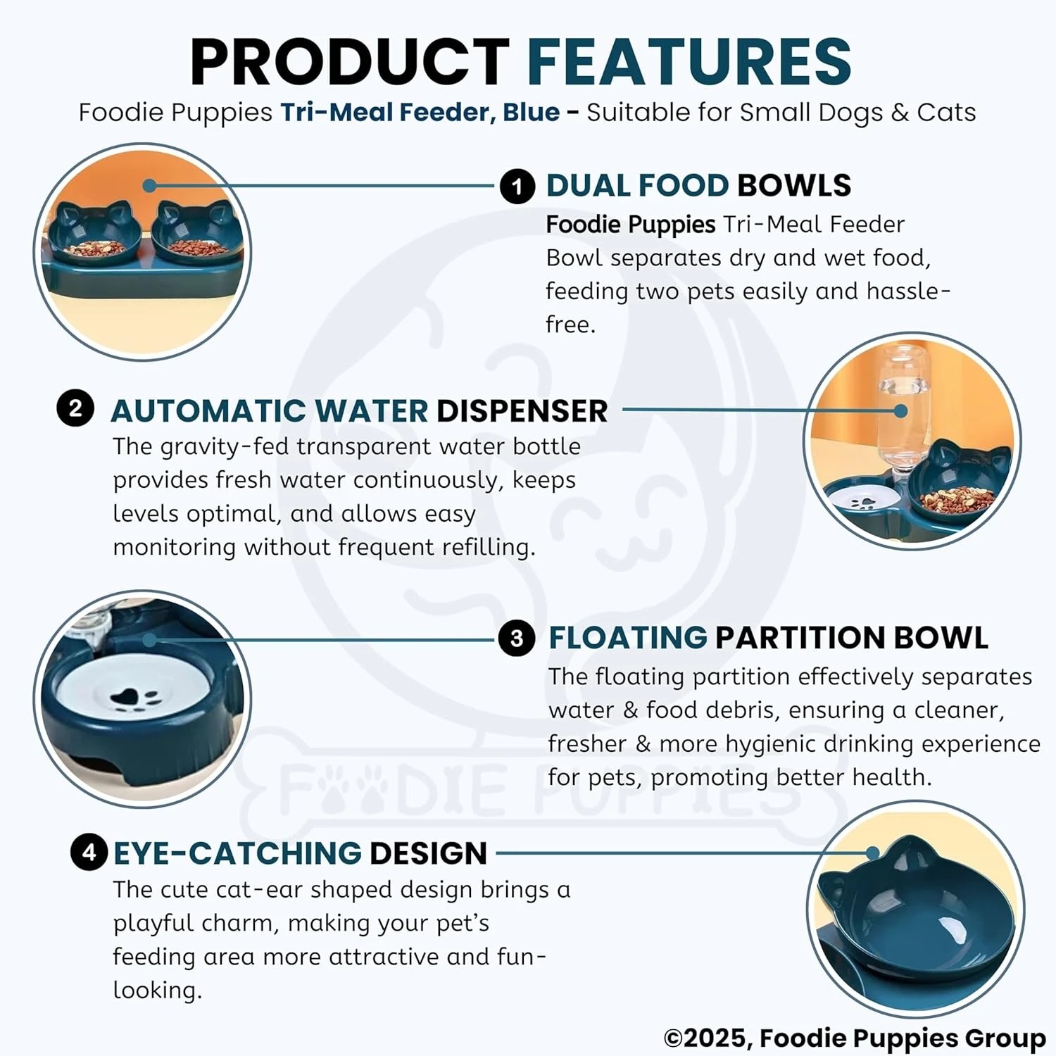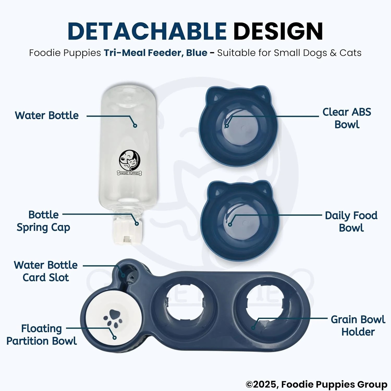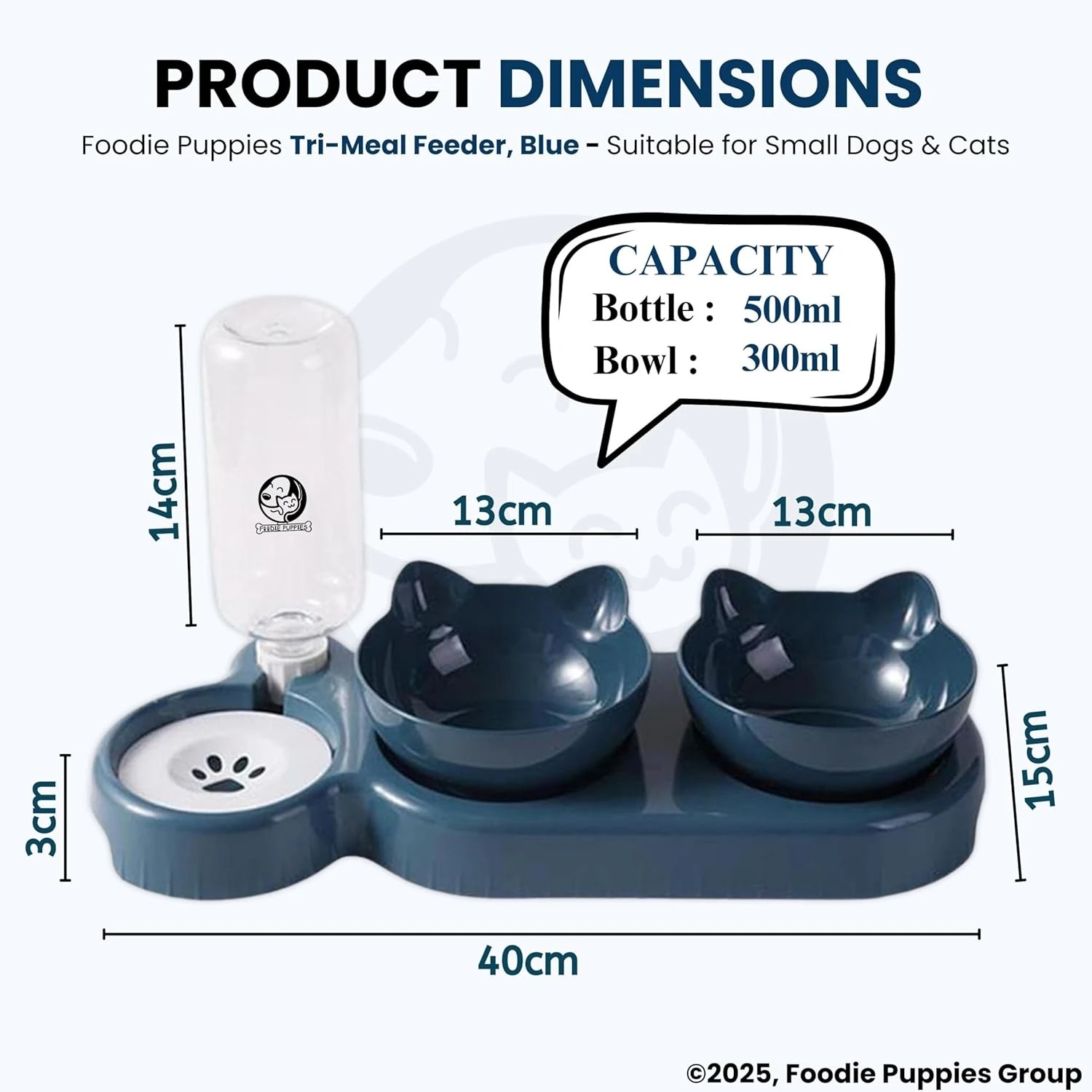 3-in-1 Cat Tri-Meal Feeder Set - (Blue) | 15° Tilted Double Bowl with Automatic Water Dispenser Bottle | Pet Detachable Water and Food Bowl for Puppies, Small Dogs, Cats and Kittens