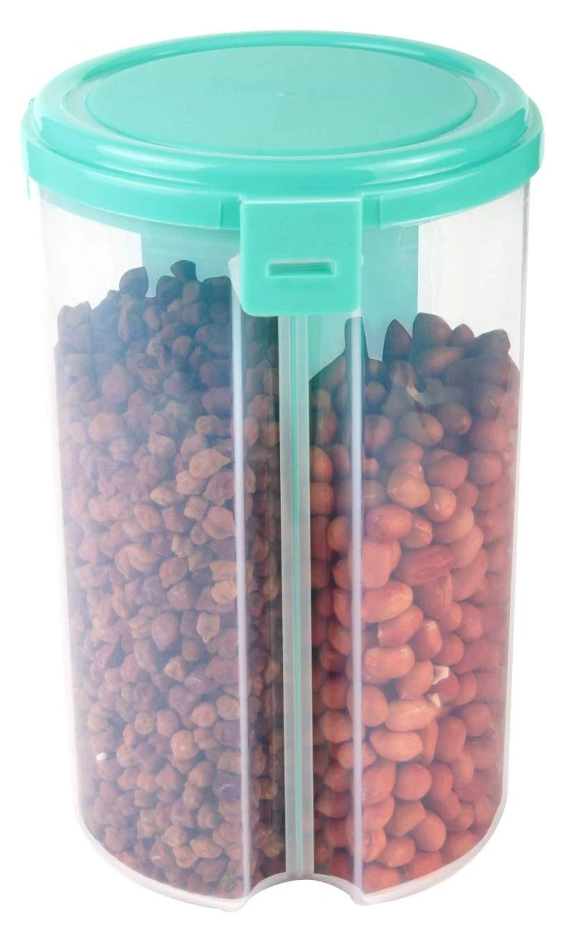• Package contains 2 Piece Food Storage Jar with 3 sections. You can Keep 2 types of foods, grains, pulses, cereals, flour, snacks, dry fruits, rice, pasta, Biscuits etc. in the same jar without mixing. 2 secure clip locks close the lid safely on the jar.