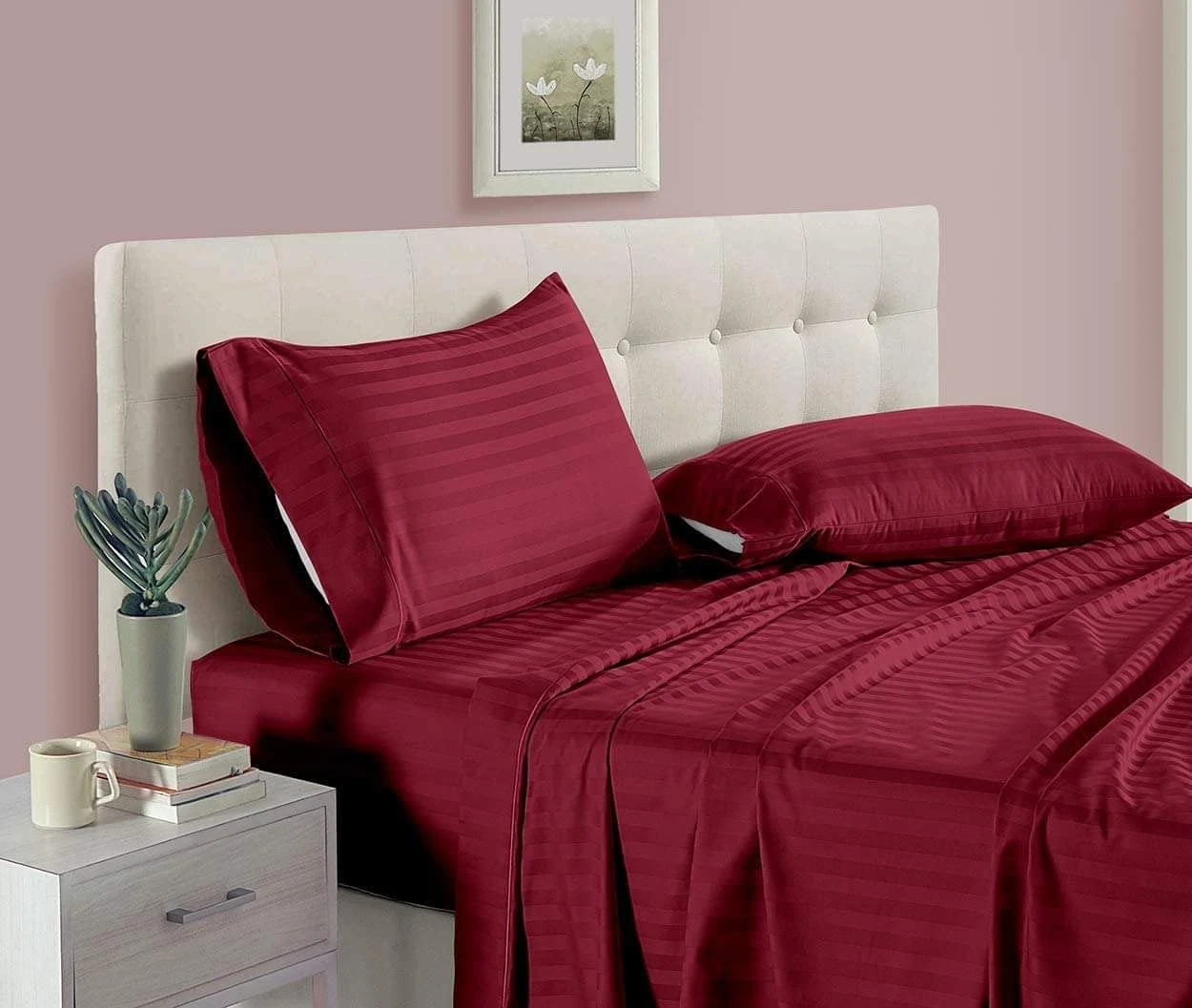 AS Enterprises Stylish and Comfortable Striped Queen Bed Sheet Set Striped Cotton Bedding Set, Queen Size 254x229 cm, 2 Pillow Covers Set 3 Maroon Pack of 1