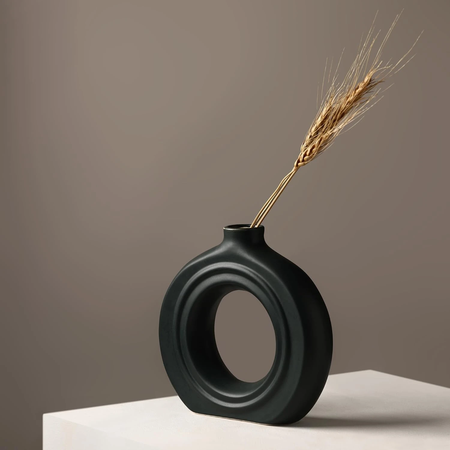 Black Ceramic Donut Vase (5 Inch) | Modern Home Decor Flower Vase for Dried Flowers & Pampas Grass | Elegant vase for Home, Living Room & Office Centerpiece Decor Pack of 1
