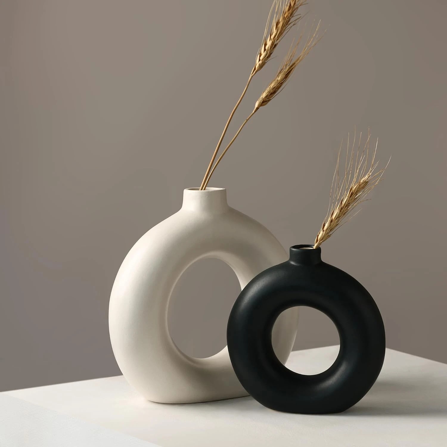 Ceramic Donut Vase | Round Hollow Centerpiece | Minimalist Flower Vase for Pampas Grass & Table Showpiece | Ideal for Living Room, Home, Shelf & Office Decor (Black & White, 7 & 9 inch)