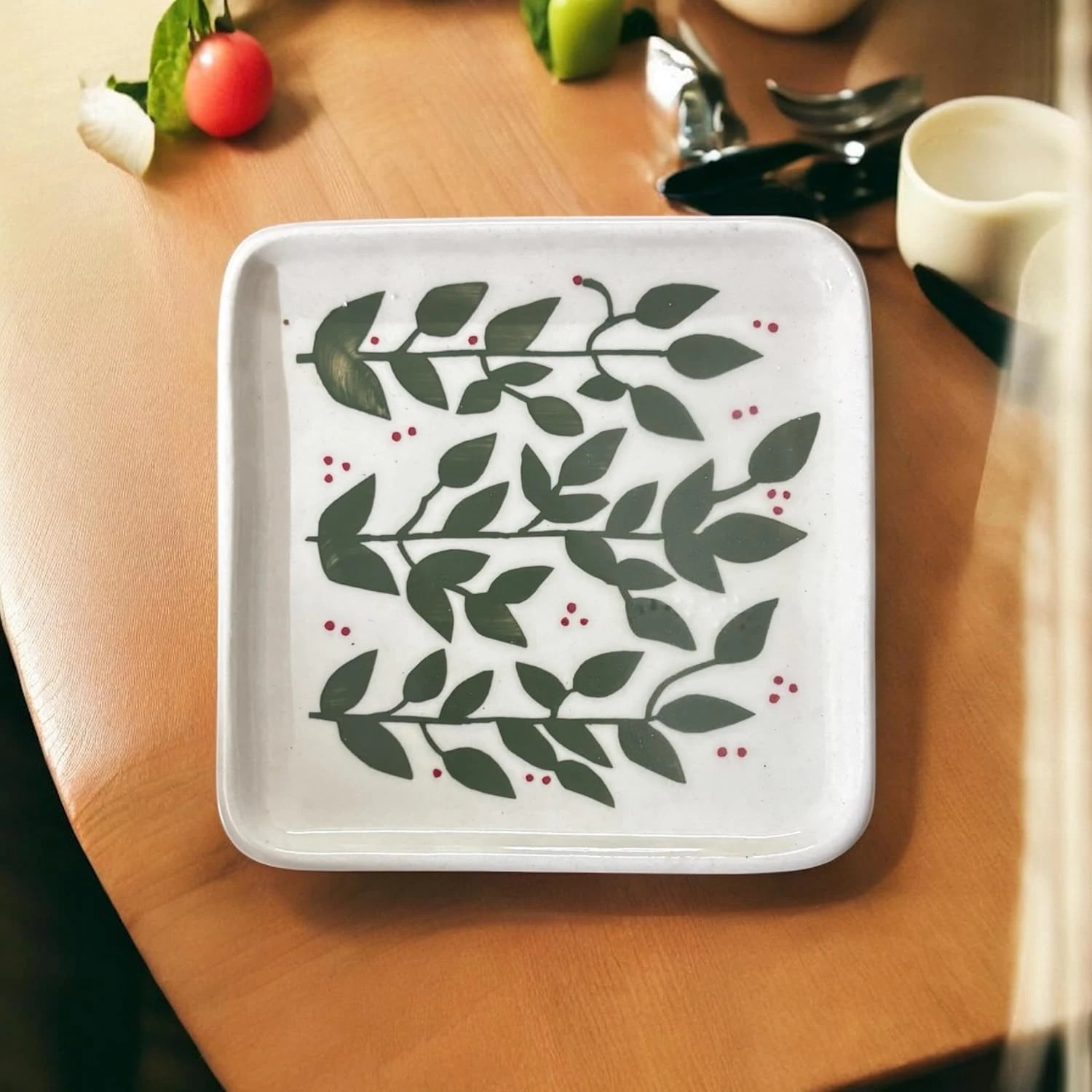 Ceramic Tea Cup and Saucer Set with Green Leaf Pattern, White