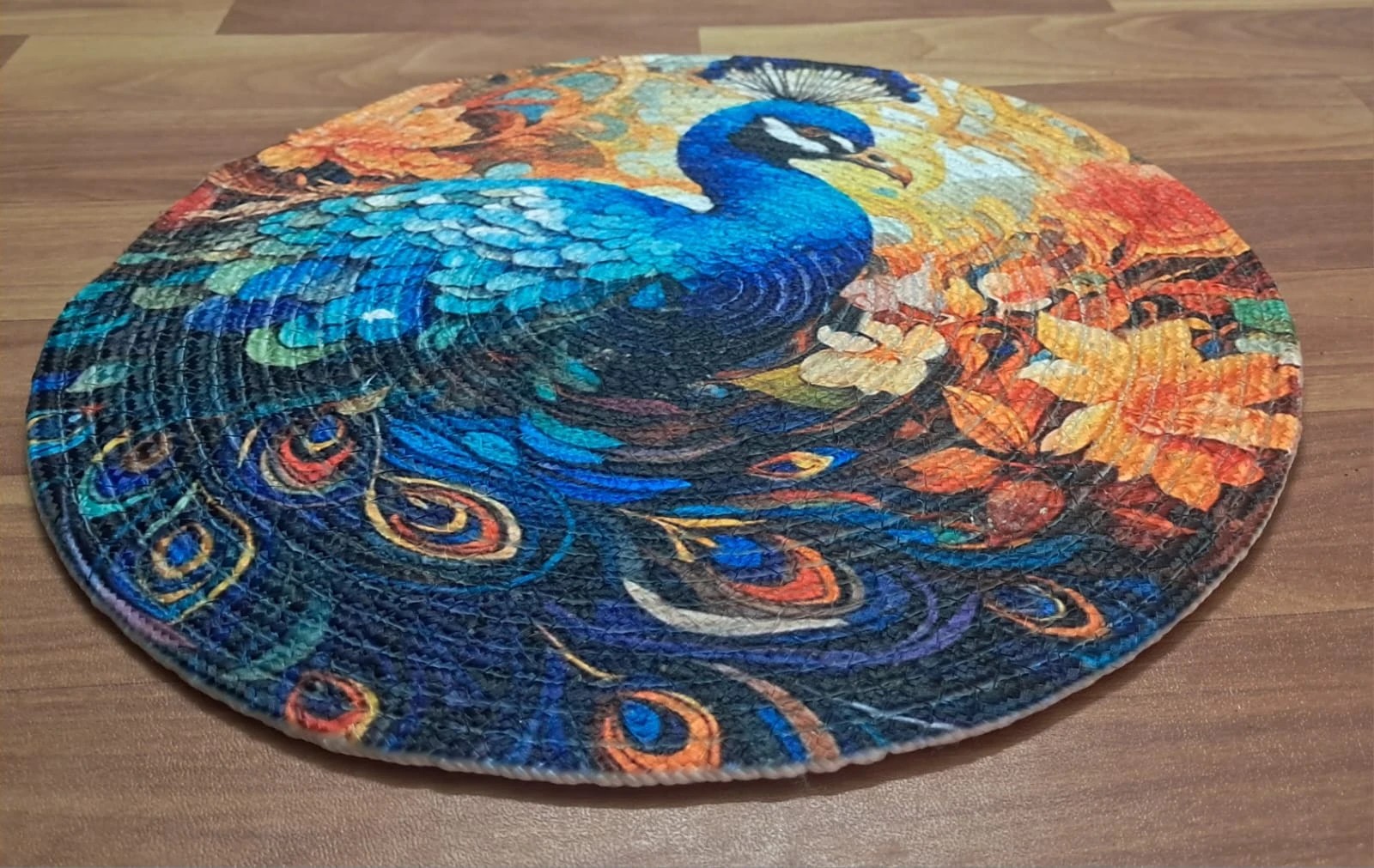 •  Beautiful round cotton placemat featuring whimsical bird and floral pattern in orange, blue, and green colours on a light background