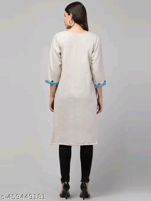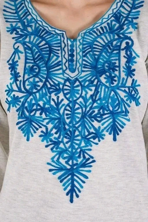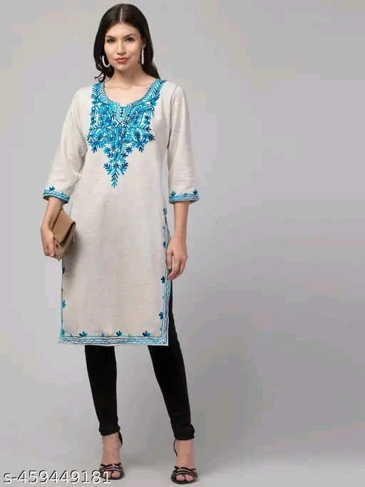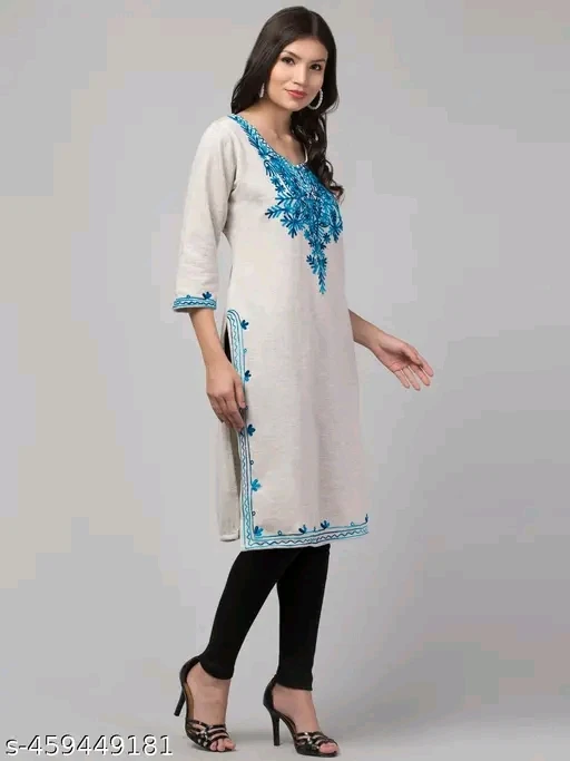 Step into timeless elegance with this beautifully crafted light-colored kurti featuring intricate blue floral embroidery. Designed with a flattering V-neckline and three-quarter sleeves, each cuff is adorned with matching embroidery for a cohesive look. The kurti’s side slits and hemline are delicately embroidered, adding a touch of sophistication. Paired with classic black leggings and complemented by black high-heeled sandals and hoop earrings, this ensemble is perfect for festive occasions, casual gatherings, or ethnic-themed events. The breathable fabric ensures comfort, while the detailed design celebrates South Asian craftsmanship.