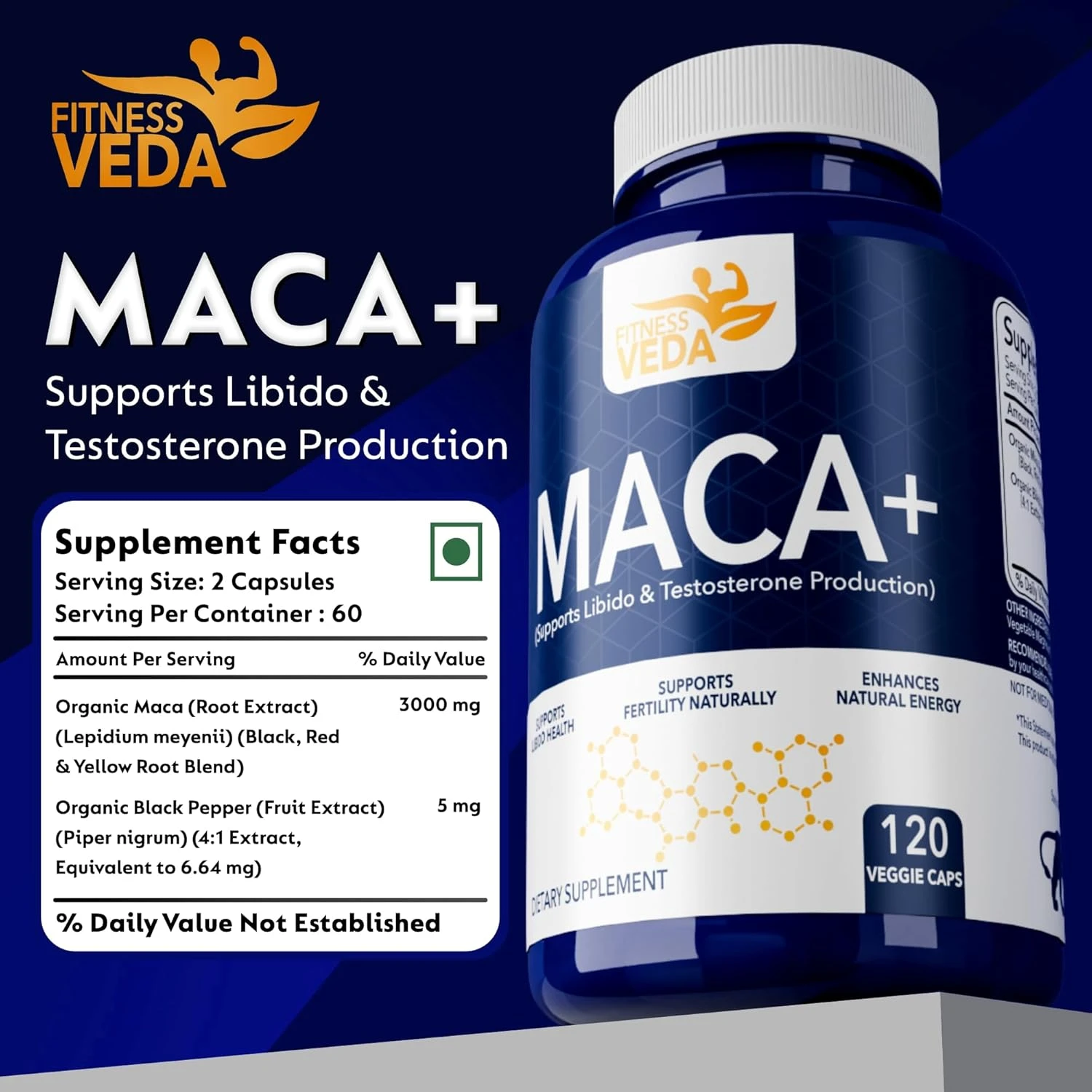 FITNESS VEDA Maca Root Capsules 120 Veggie Caps – Organic Maca Supplement for Men & Women – Energy & Stamina Support – Plant-Based, Non-GMO, Gluten-Free