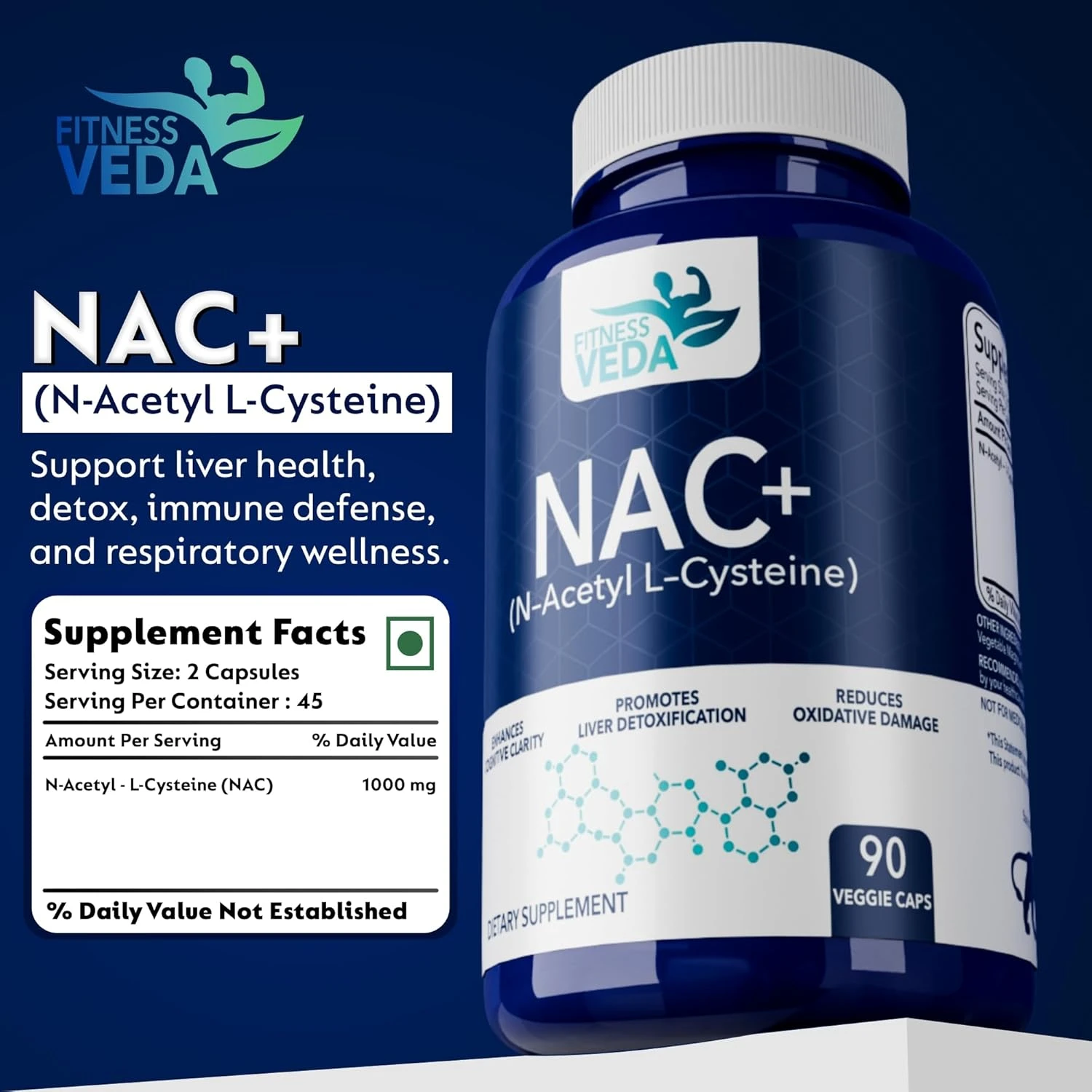 Fitness Veda NAC+ | N-Acetyl Cysteine Supplement | Antioxidant & Detox Support | 1000mg Capsules | Non-GMO, Stimulant-Free, 90 Count