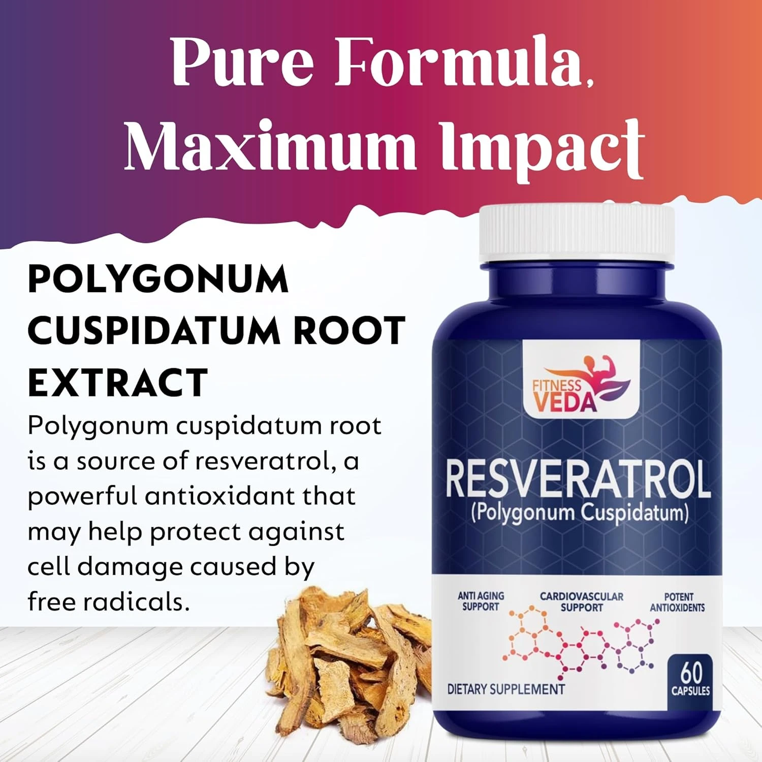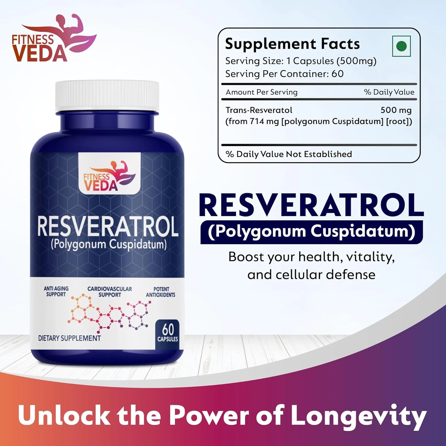 FITNESS VEDA Trans Resveratrol 99.9% Pure 500 mg Supplement Healthy Aging forver youth | Anti-Inflammatory | Improves Metabolism and Heart health (60 Veg Capsules)