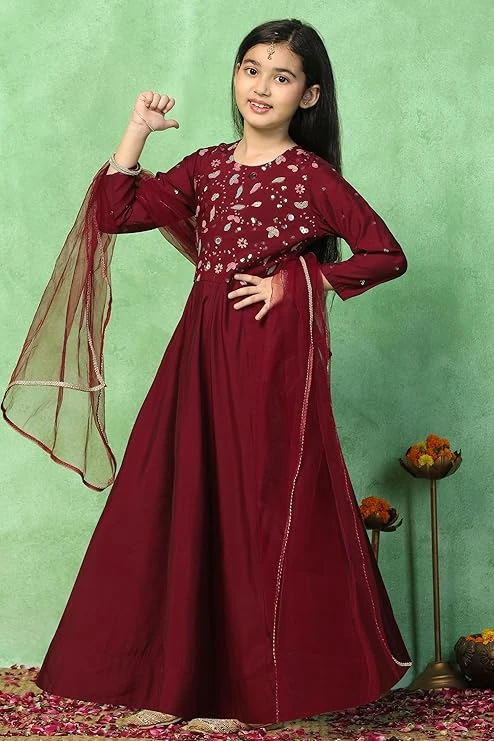 Girl's Embroidered Maxi Dress with Dupatta Ethnic Dress for Girls | Maxi Length Dress with Dupatta | Embroidered Dress | Long Dresses Size: 12-14 Year Color Maroon