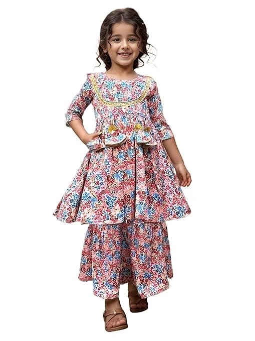 Girls Poly Silk Floral Printed 3/4 Sleeve Sharara Set | Traditional Ethnic Wear Clothing Set for Festival and Special Occasions Size Age 11-12 Year White Pink