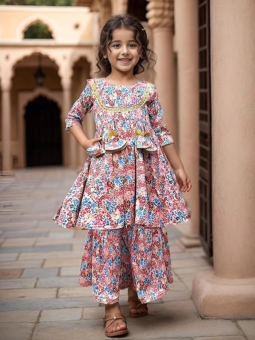 Girls Poly Silk Floral Printed 3/4 Sleeve Sharara Set | Traditional Ethnic Wear Clothing Set for Festival and Special Occasions Size Age 11-12 Year White Corel