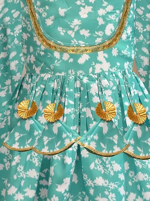 Girls Poly Silk Floral Printed 3/4 Sleeve Sharara Set | Traditional Ethnic Wear Clothing Set for Festival and Special Occasions Size Age 11-12 Year Light Blue