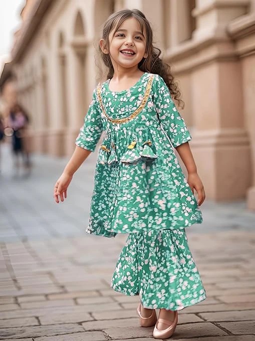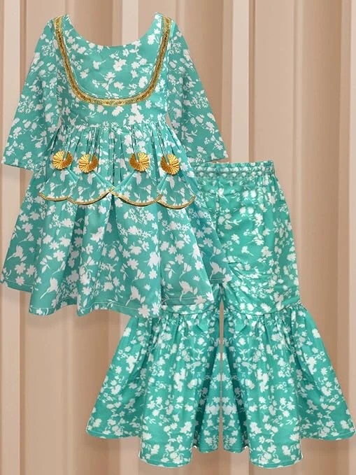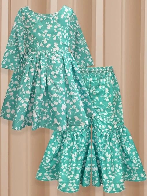 Girls Poly Silk Floral Printed 3/4 Sleeve Sharara Set | Traditional Ethnic Wear Clothing Set for Festival and Special Occasions Size Age 11-12 Year Color Light Green