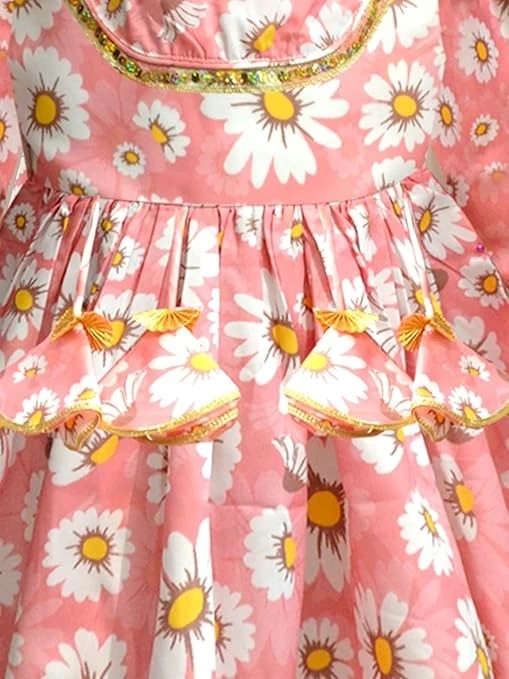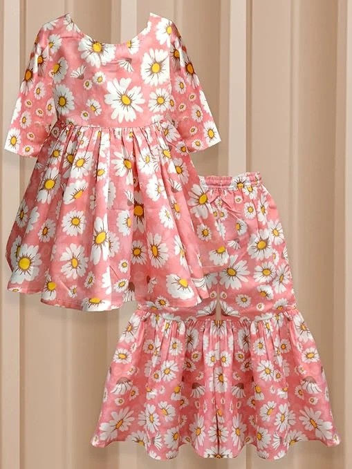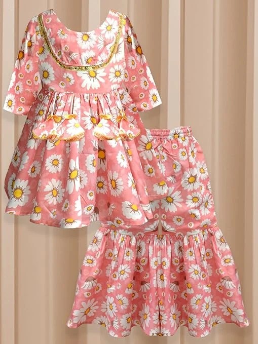 Girls Poly Silk Floral Printed 3/4 Sleeve Sharara Set | Traditional Ethnic Wear Clothing Set for Festival and Special Occasions Size Age 11-12 Year Color Light Pink