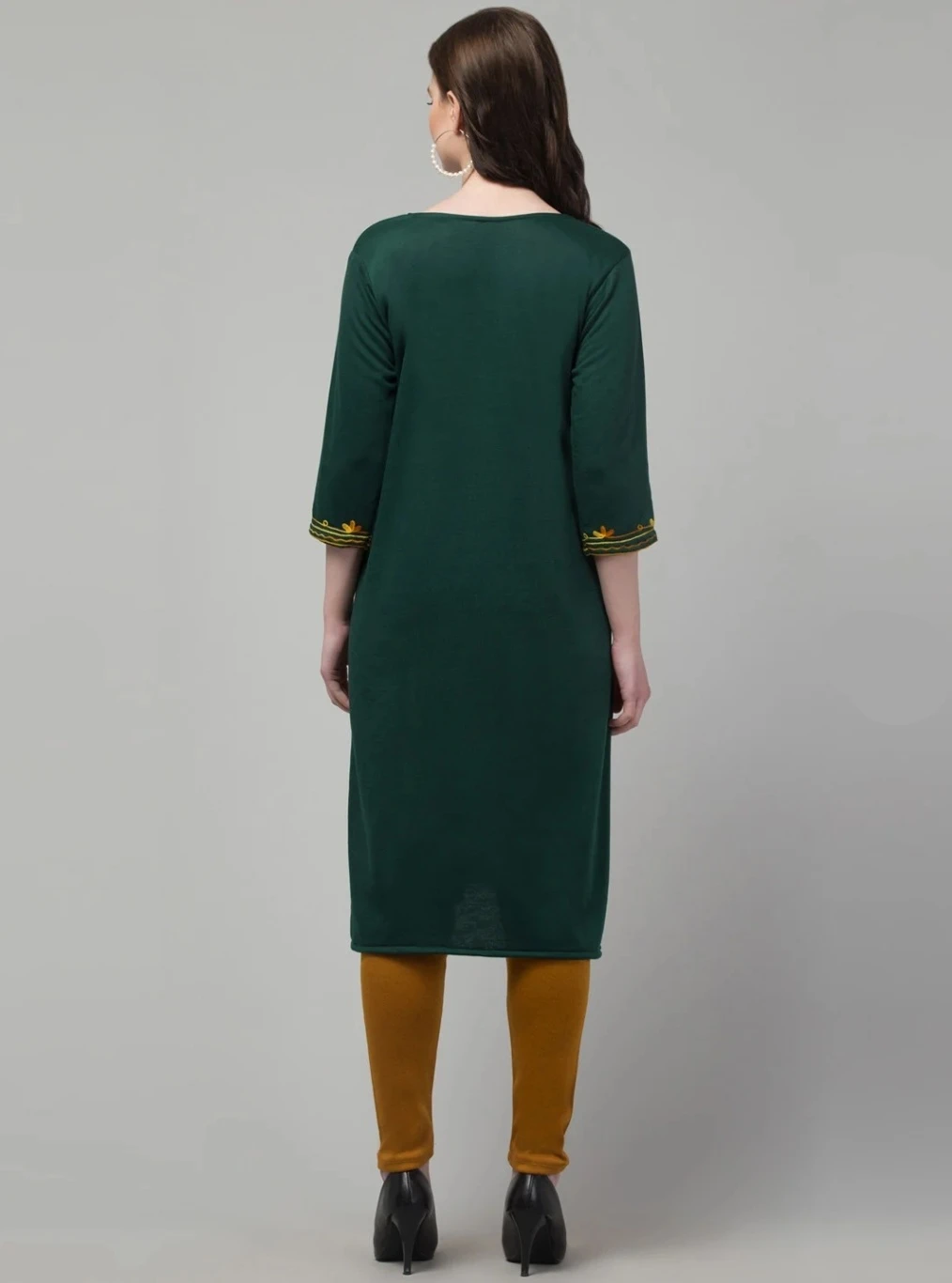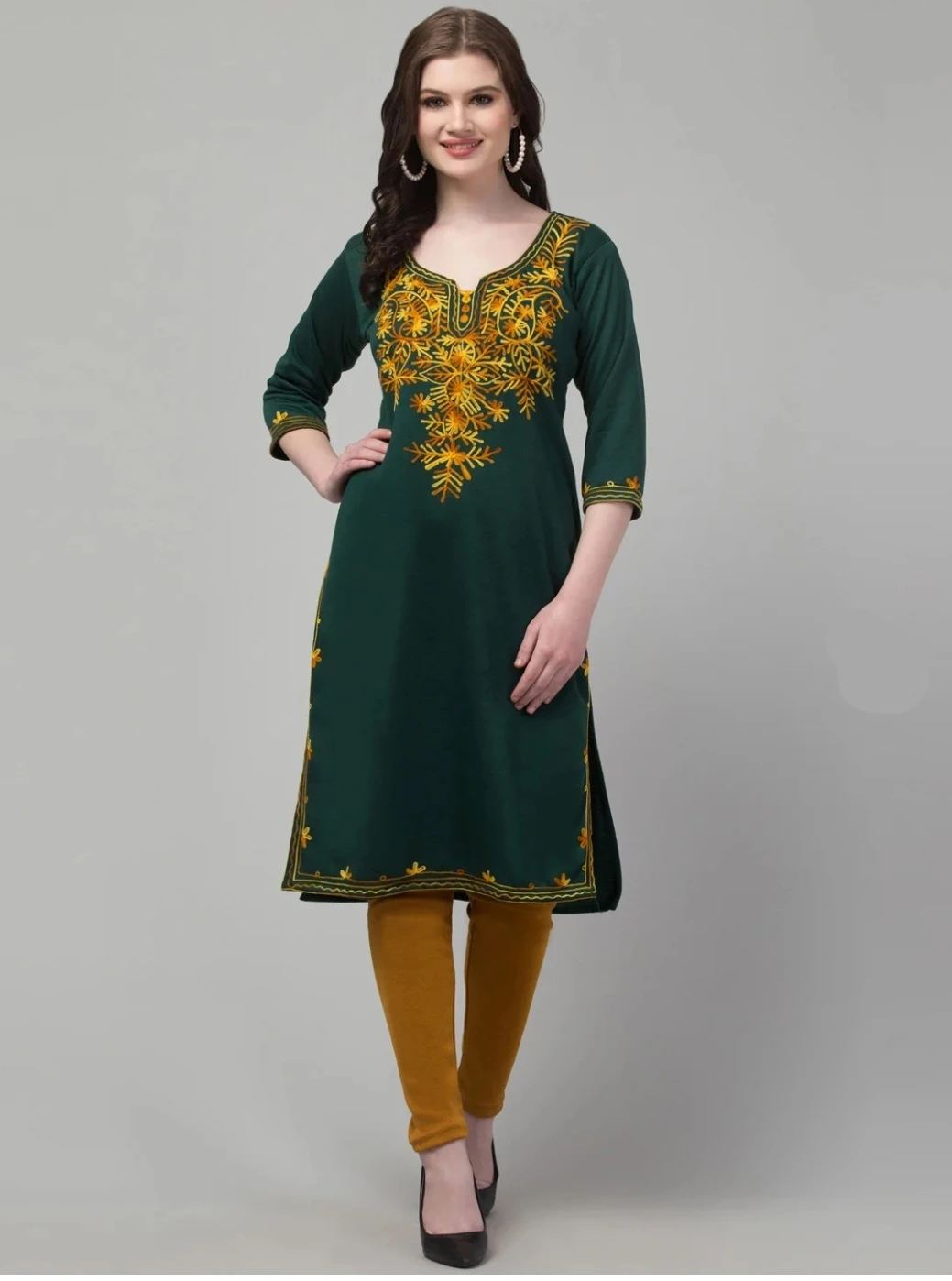Celebrate tradition with a bold twist in the Golden Fern Kurti Ensemble. This dark green kurti features radiant yellow floral embroidery that blooms across the front, sleeves, and hemline, creating a lively contrast that captures attention. The round neckline with a subtle slit and three-quarter sleeves offer a classic silhouette, while mustard yellow churidar leggings and black heels complete the look with elegance. Perfect for festive occasions, cultural gatherings, or stylish daywear, this outfit blends heritage craftsmanship with contemporary flair.