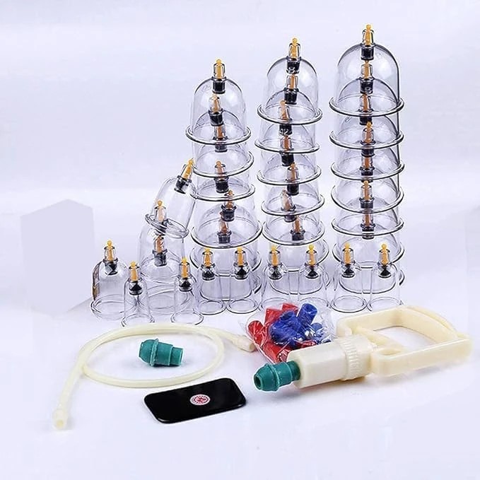 Complete HIJAMA Cupping Therapy Kit – Includes a set of durable plastic cups in various sizes and a powerful air suction pump for safe, hygienic, and effective body cupping therapy.