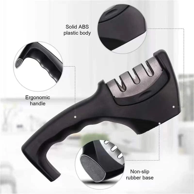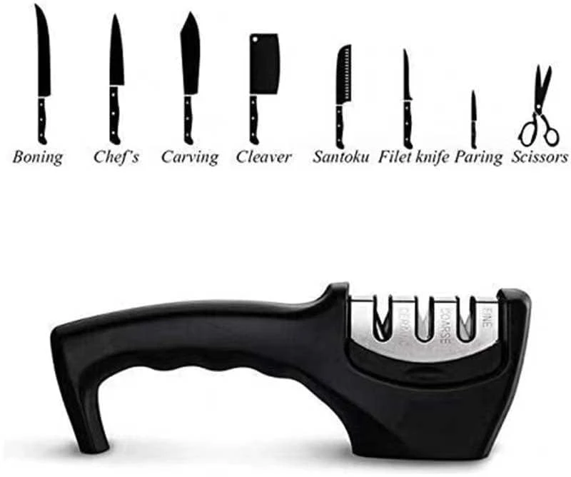 Knife Sharpener 3-Slot Quality Kitchen Accessories to Repair, Grind, Polish Blade, Professional Sharpening Tool for Knives, Easy Manual Sharpener.Cut-Resistant Glove Included, Black