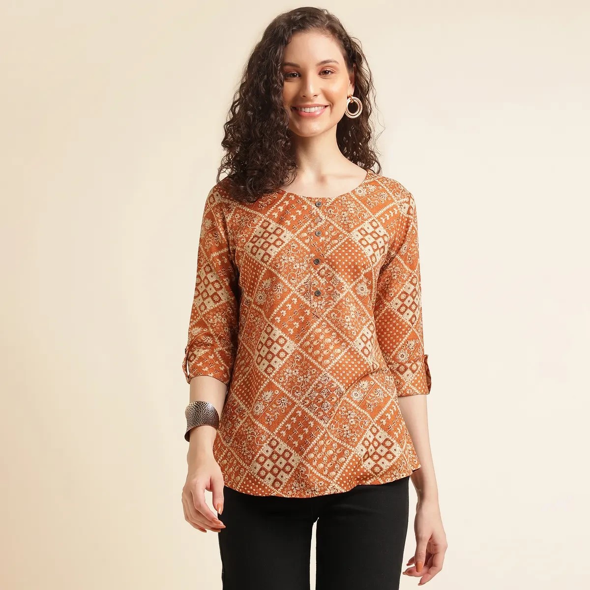 Brown Rayon Slub Casual Daily Wear Top For Women