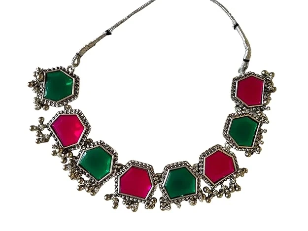 Presents Stylish Hexagon Shape eight different Colour Stone Studded Oxidized Jewellery Necklace Set for Women & Girls.(necklace & earrings set of 2