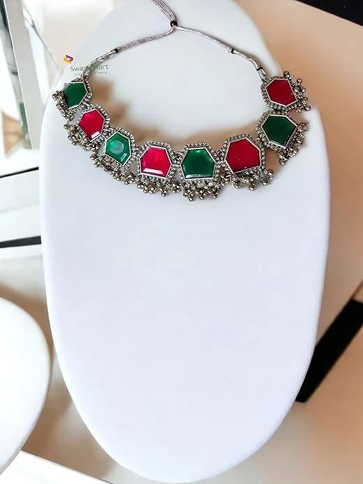 Presents Stylish Hexagon Shape eight different Colour Stone Studded Oxidized Jewellery Necklace Set for Women & Girls.(necklace & earrings set 1)