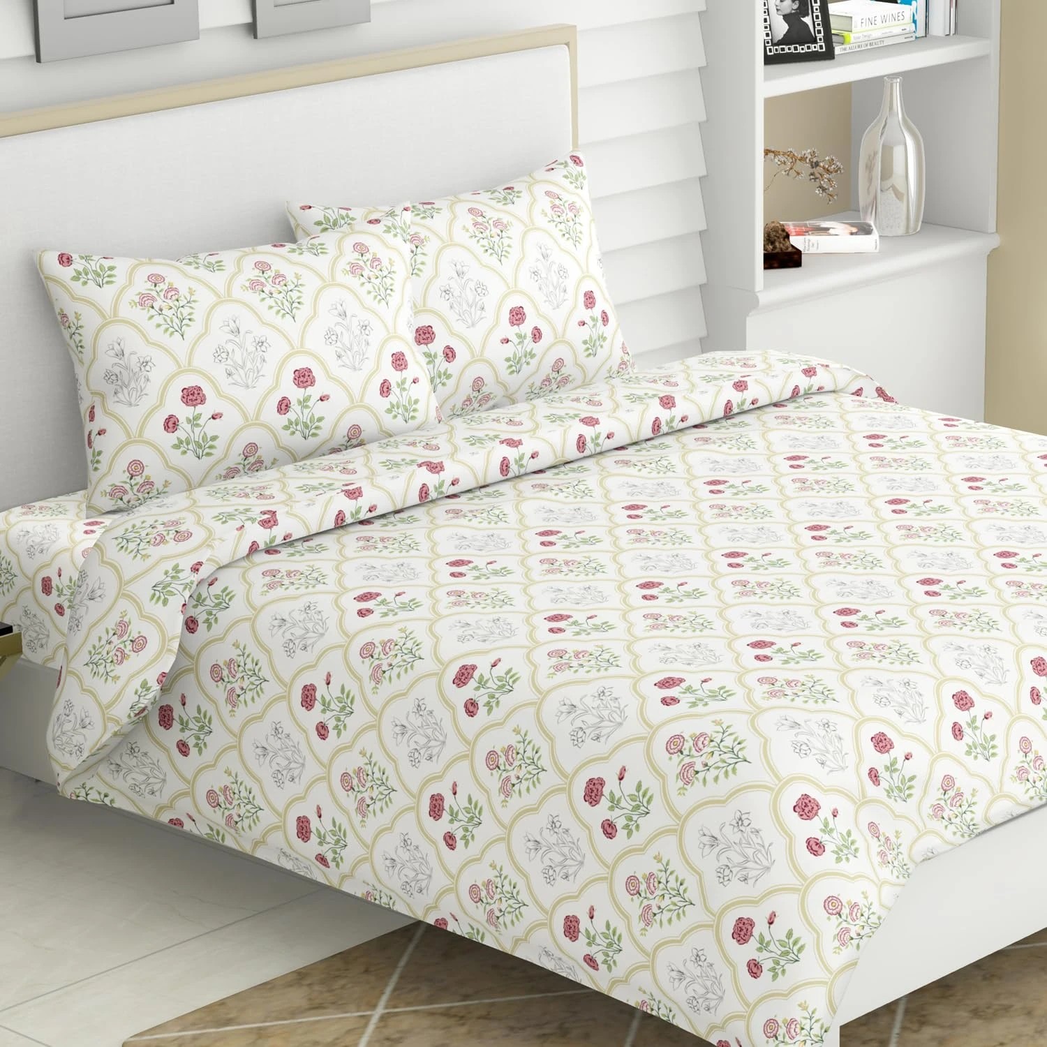Pure Cotton King Size Floral Bedsheet with 2 Pillow Covers for Double Bed 186 TC 108X108 Inches Flat Bed Sheet | Rose Serenity