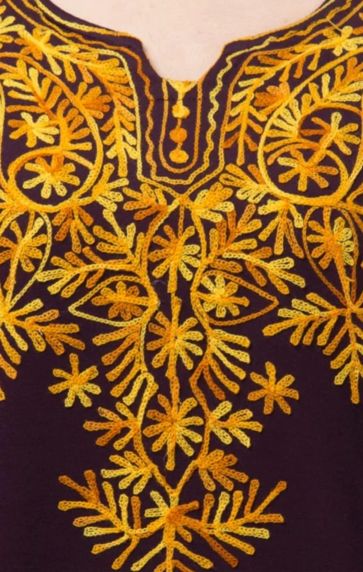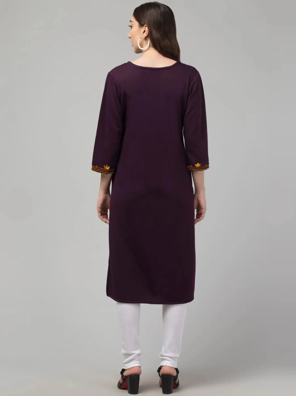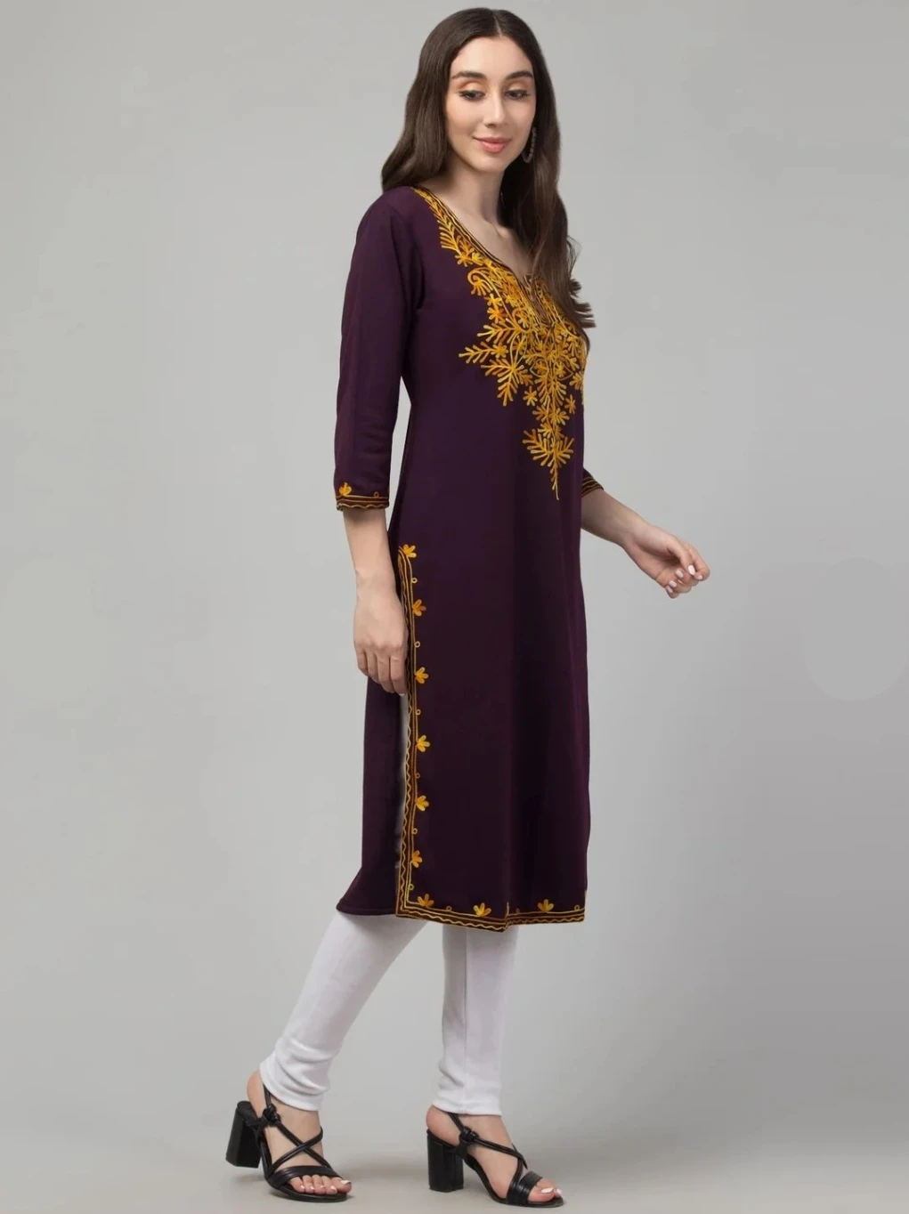 The Noor-e-Zehra ensemble is a celebration of timeless elegance and traditional artistry. This dark purple kurti features intricate yellow floral embroidery that cascades gracefully from the neckline down the chest, echoing the richness of South Asian textile heritage. The symmetrical patterns on the cuffs, hemline, and side seams add a regal touch, while the straight-cut silhouette and three-quarter sleeves offer modern comfort. Paired with crisp white leggings and classic black sandals, this look bridges tradition and contemporary flair—perfect for festive gatherings, cultural events, or everyday grace.