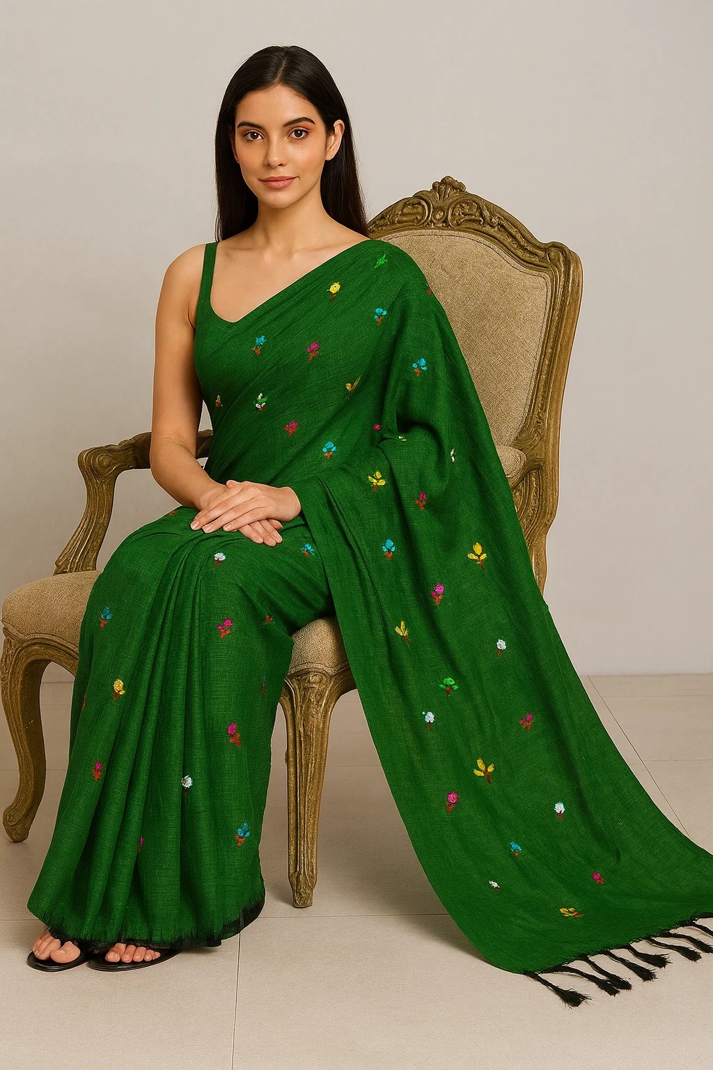 SAREEN Handcrafted Pure Khadi Cotton Saree, Multicolor Hand-Embroidered Floral Motifs, Traditional Style with Tassels (Bottle Green)