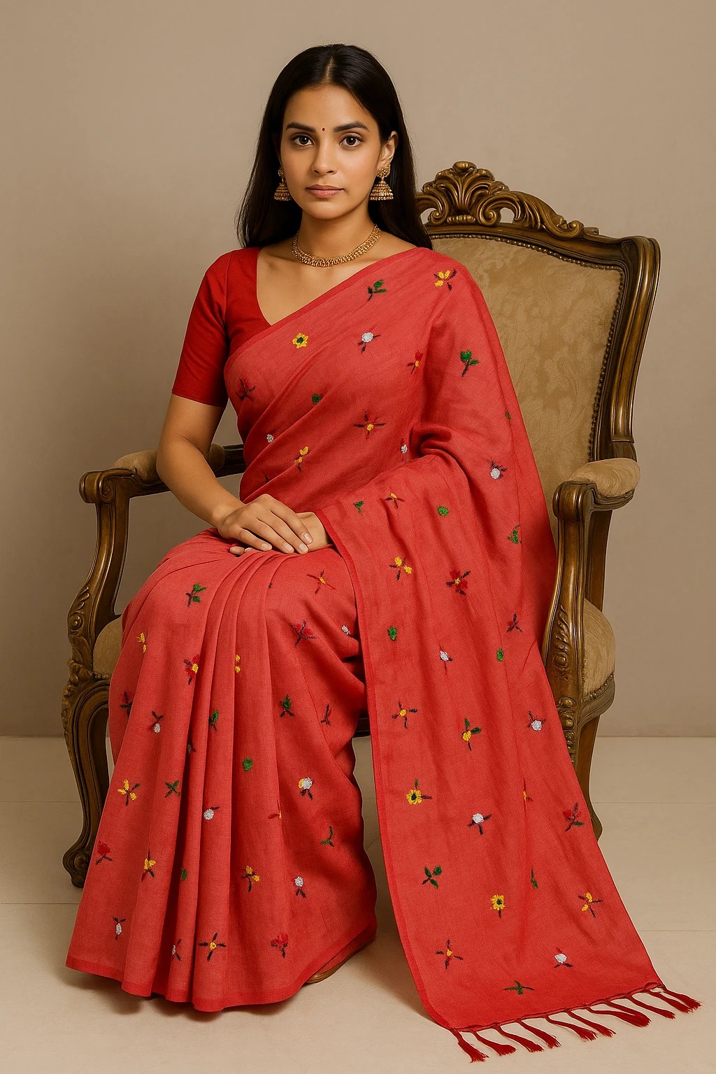 SAREEN Handcrafted Pure Khadi Cotton Saree, Multicolor Hand-Embroidered Floral Motifs, Traditional Style with Tassels (Brick Red)