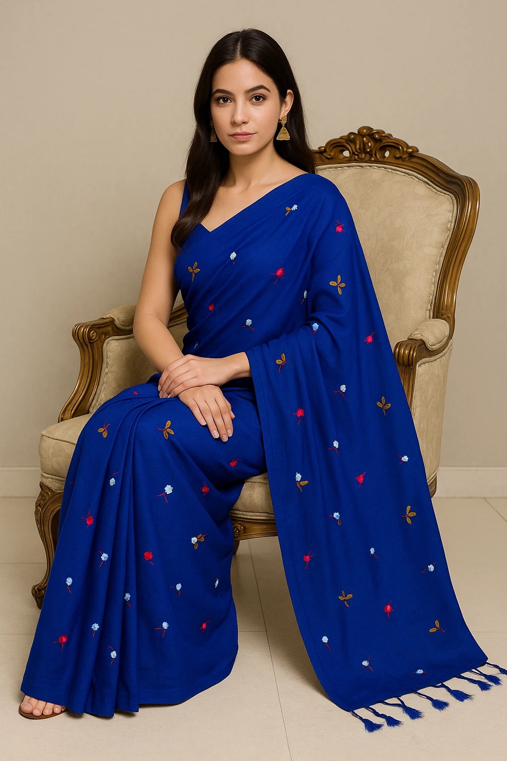 SAREEN Handcrafted Pure Khadi Cotton Saree, Multicolor Hand-Embroidered Floral Motifs, Traditional Style with Tassels (Bright Royal Blue)