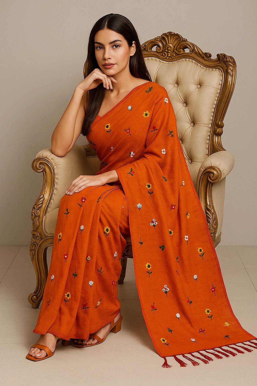 SAREEN Handcrafted Pure Khadi Cotton Saree, Multicolor Hand-Embroidered Floral Motifs, Traditional Style with Tassels (Burnt Orange)