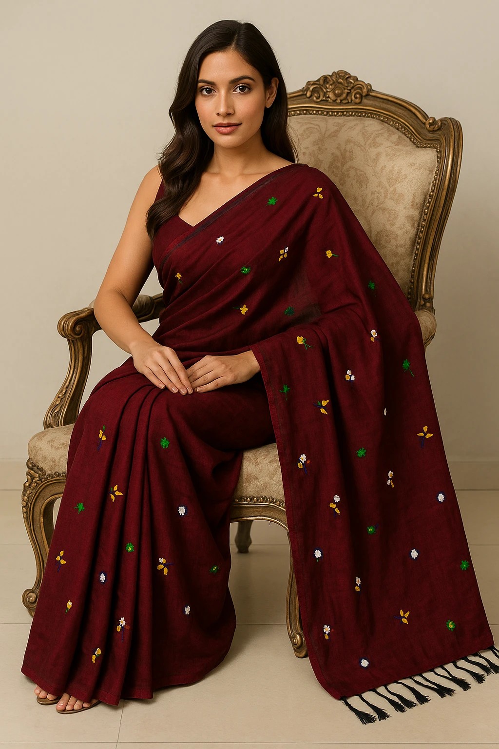 SAREEN Handcrafted Pure Khadi Cotton Saree, Multicolor Hand-Embroidered Floral Motifs, Traditional Style with Tassels (Maroon)