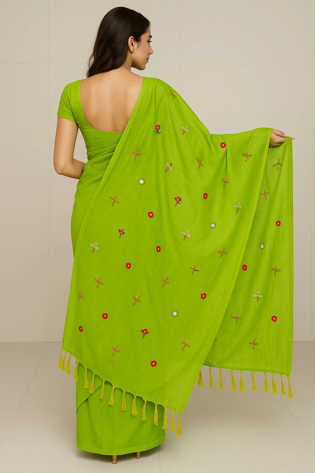 SAREEN Handcrafted Pure Khadi Cotton Saree, Multicolor Hand-Embroidered Floral Motifs, Traditional Style with Tassels (Parrot Green)
