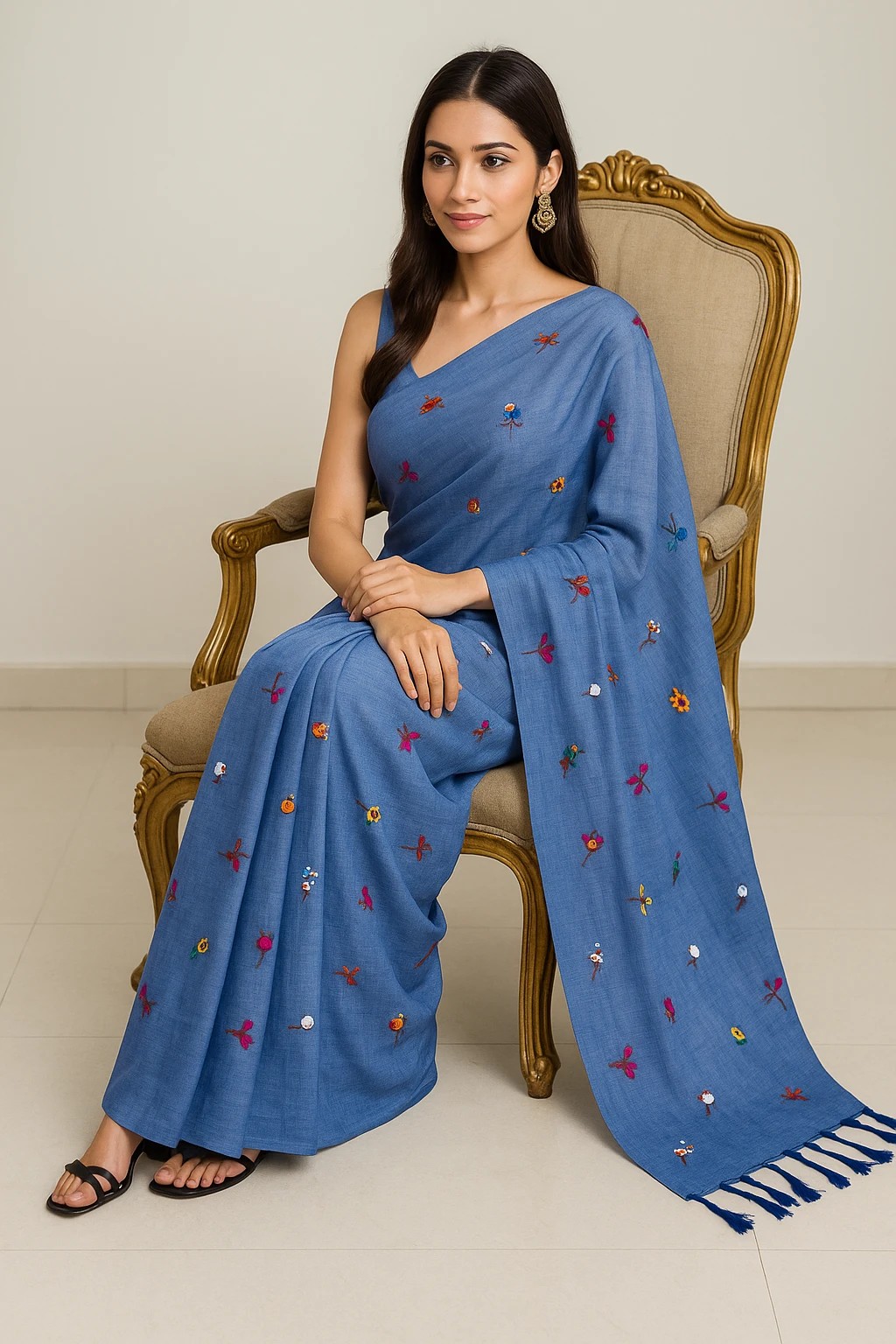 SAREEN Handcrafted Pure Khadi Cotton Saree, Multicolor Hand-Embroidered Floral Motifs, Traditional Style with Tassels (Sky Blue)