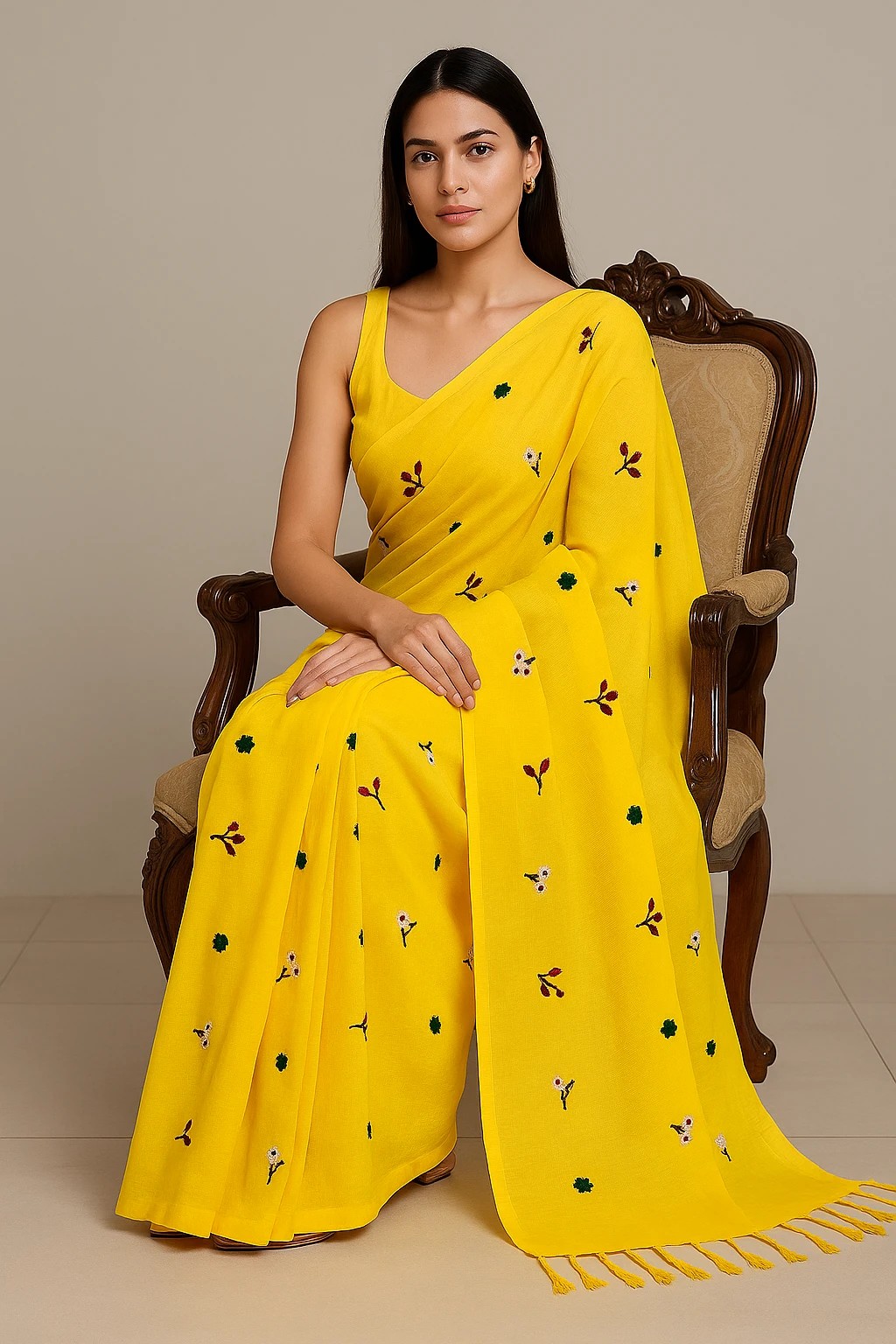 SAREEN Handcrafted Pure Khadi Cotton Saree, Multicolor Hand-Embroidered Floral Motifs, Traditional Style with Tassels (Yellow)