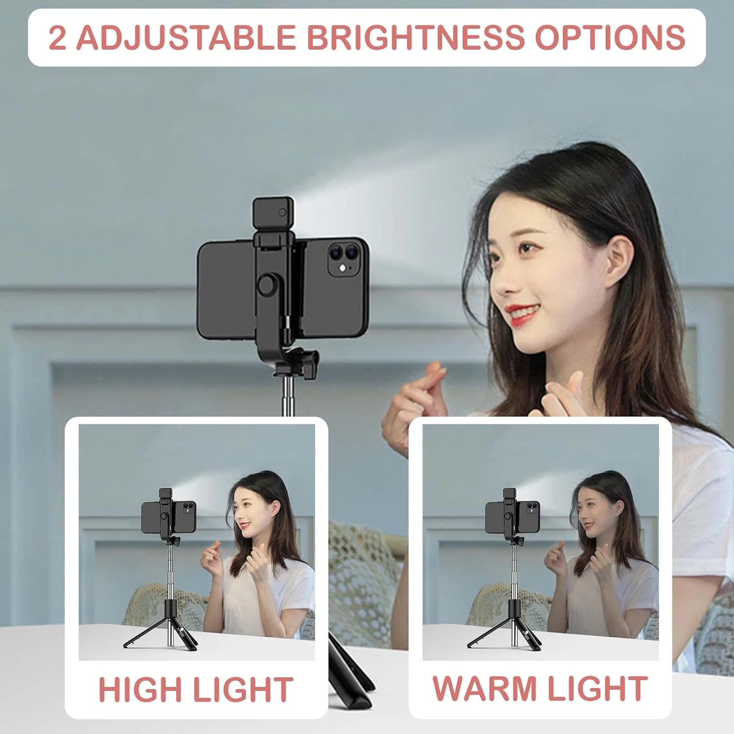 Selfie stick with tripod stand light features 2 brightness levels in White light mode providing optimal lighting for your photos in any environment. Elevate your selfies with adjustable lighting at your fingertip