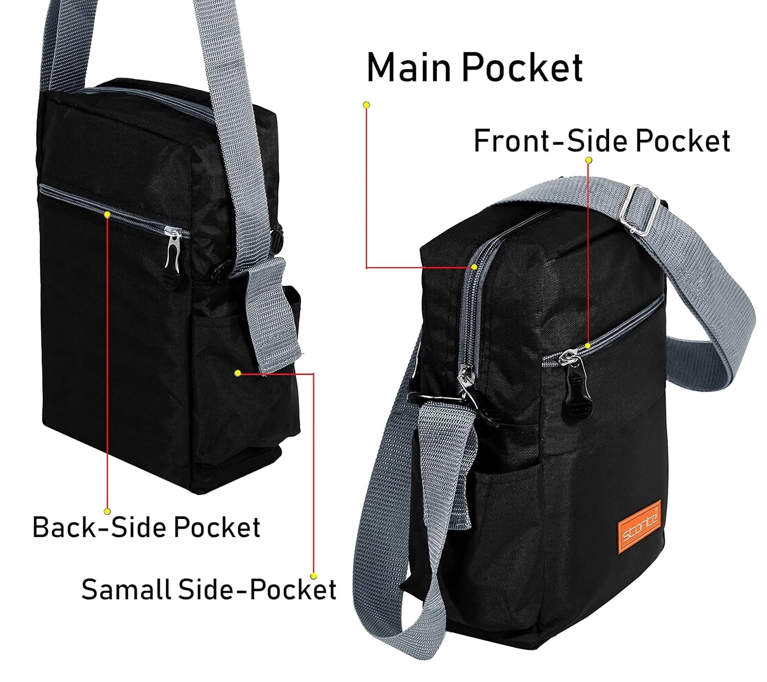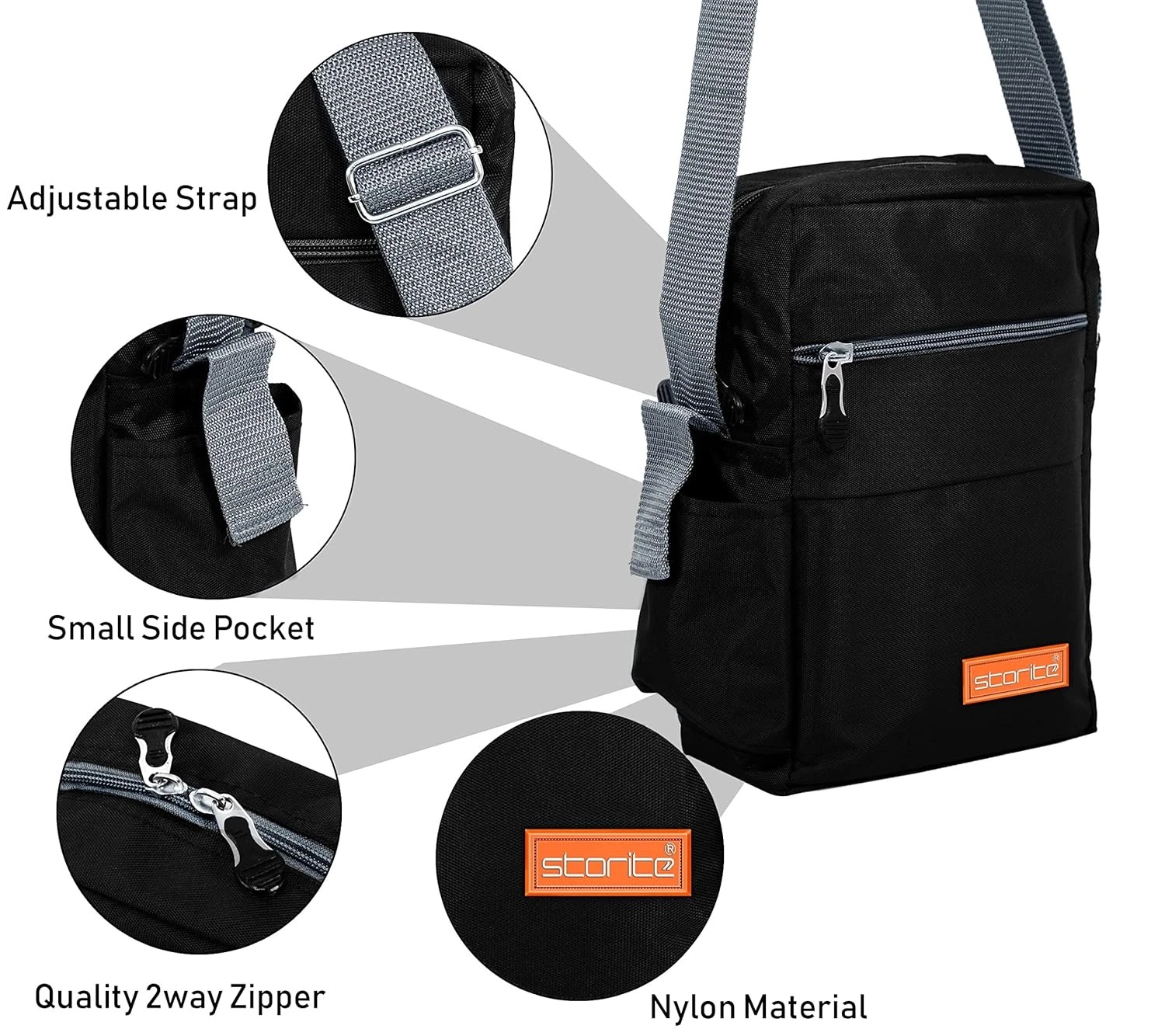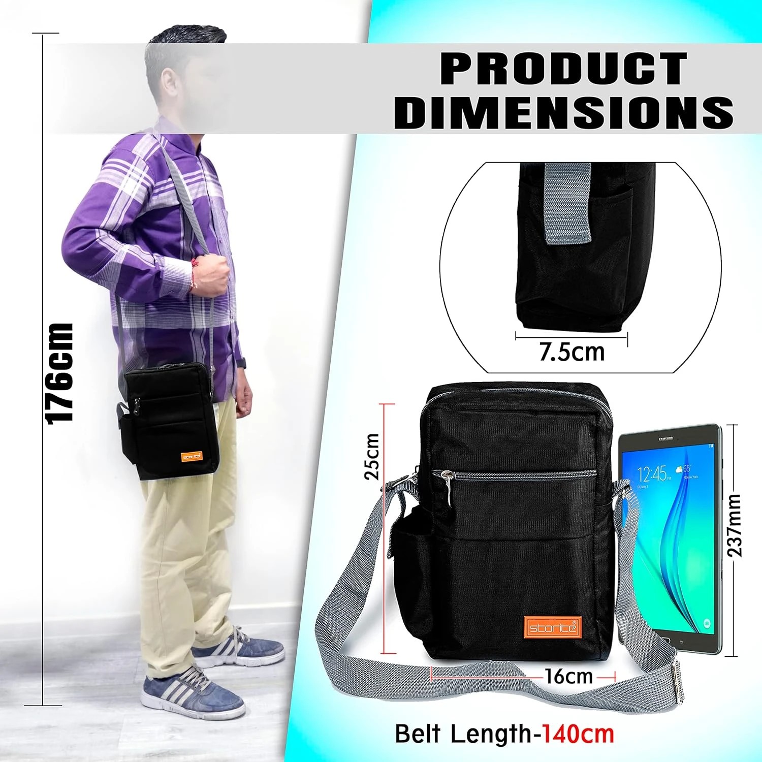 •  Messenger Sling Bag Dimensions – Length (Horizontal distance) - 16cm, Height - 25cm, Width - 7.5cm. small capacity but perfectly fits up to 9" Tablet.
