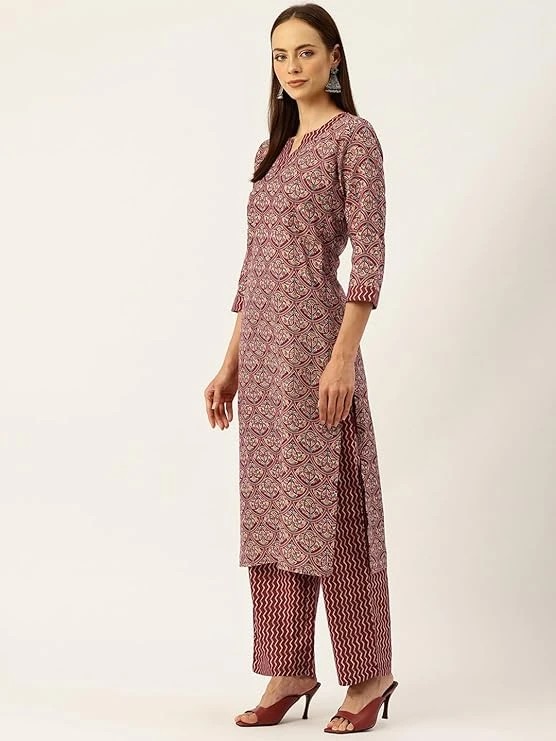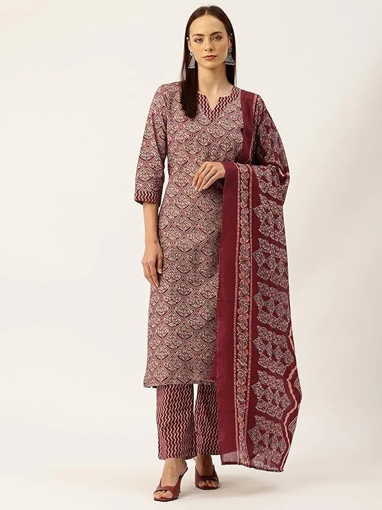 Women Cotton Straight Printed Suit Set Size Medium Color Maroon