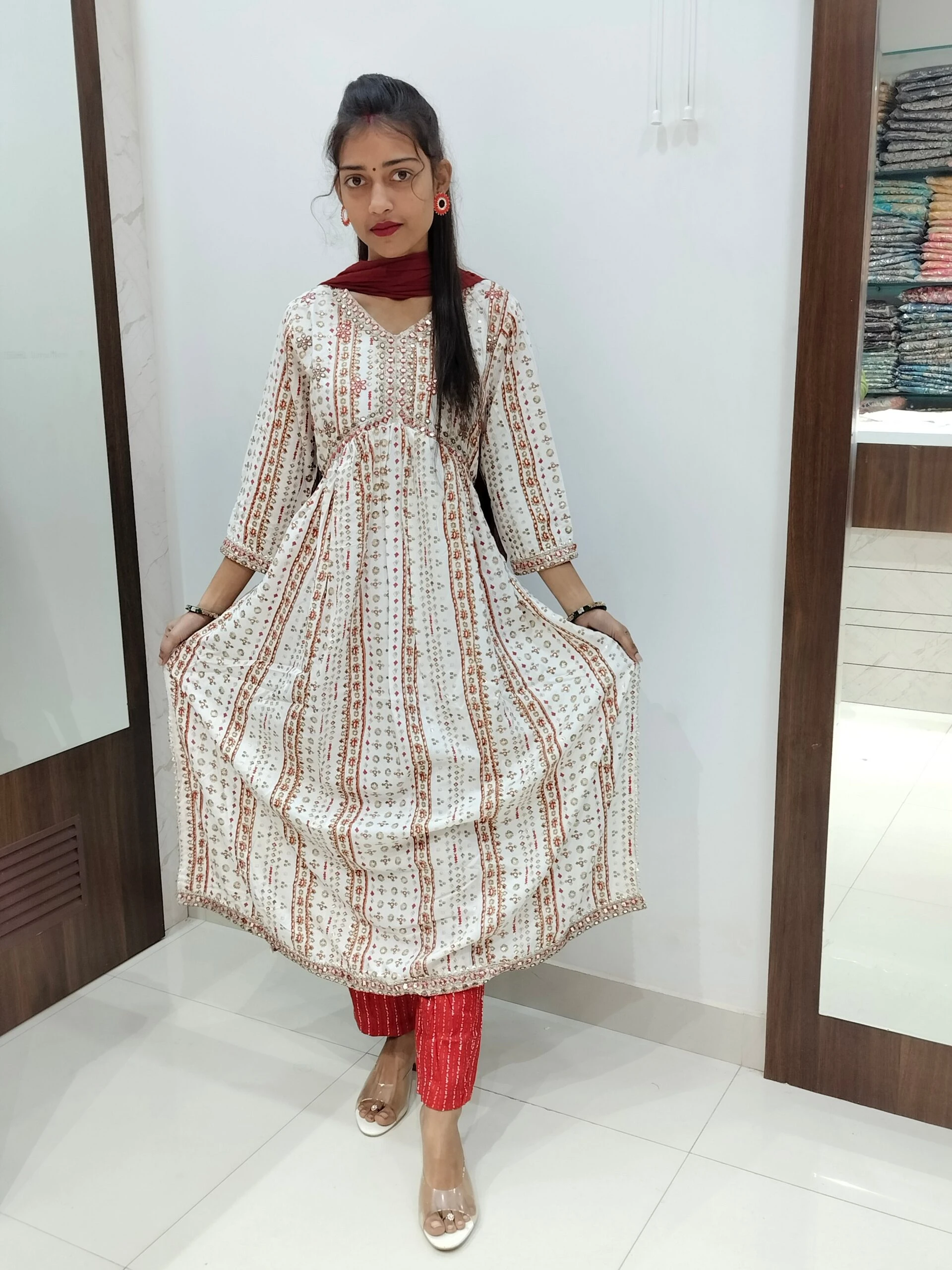 Women's Aliya with anarkali pattern Embroidered Kurta with Pant and Dupatta Set Size Medium Color White