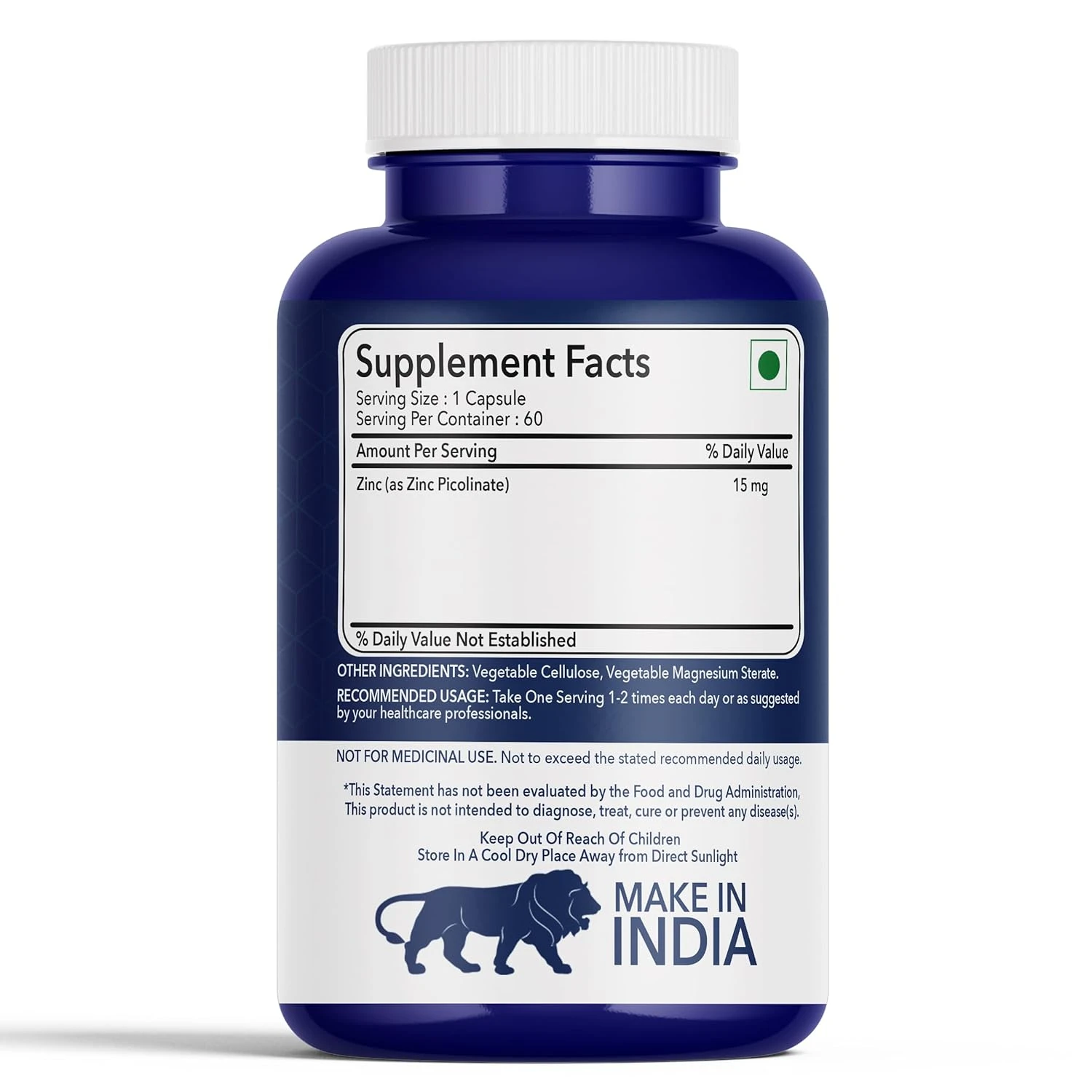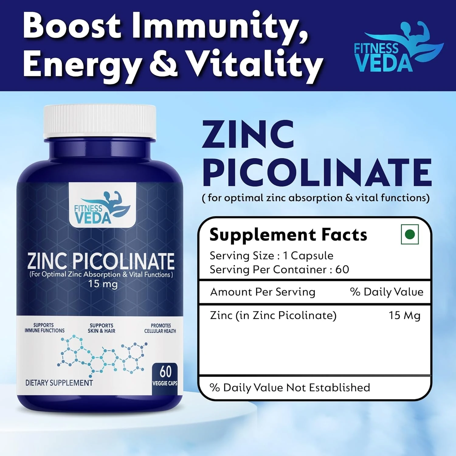 Zinc Picolinate 15mg – High Absorption Zinc Supplement for Immune Support | Skin Health, Hair & Metabolism | Promotes Cellular Health – 60 Vegetarian Capsules