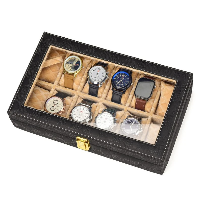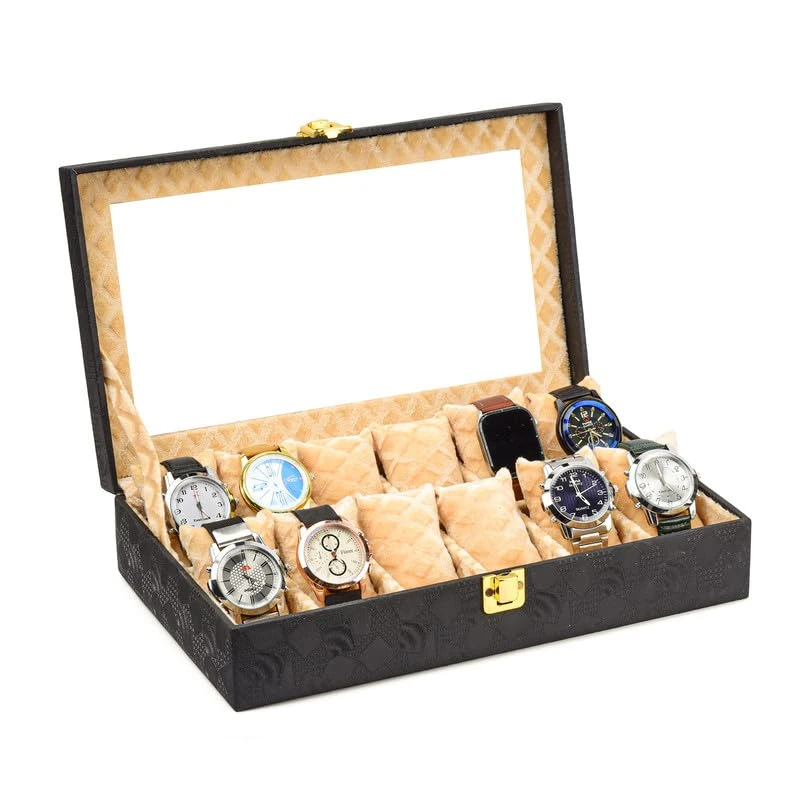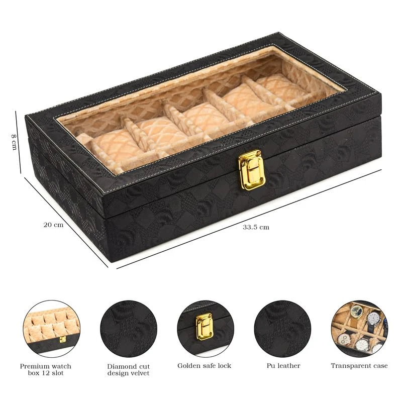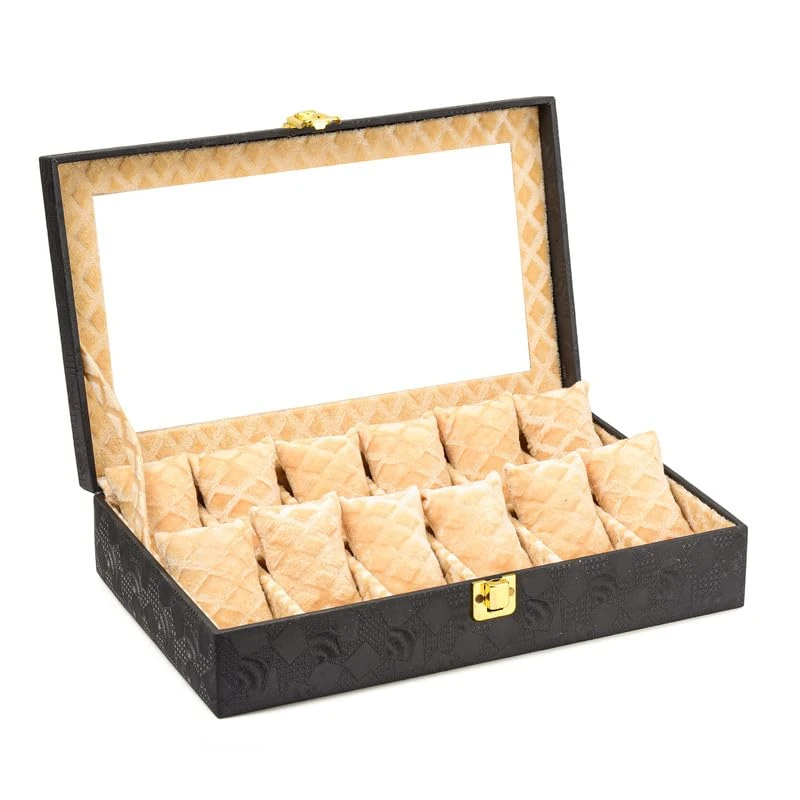 12-Slot Watch Box Organizer for Men & Women Gift Box – Durable Leatherette with Soft Pillows (Black::Beige)