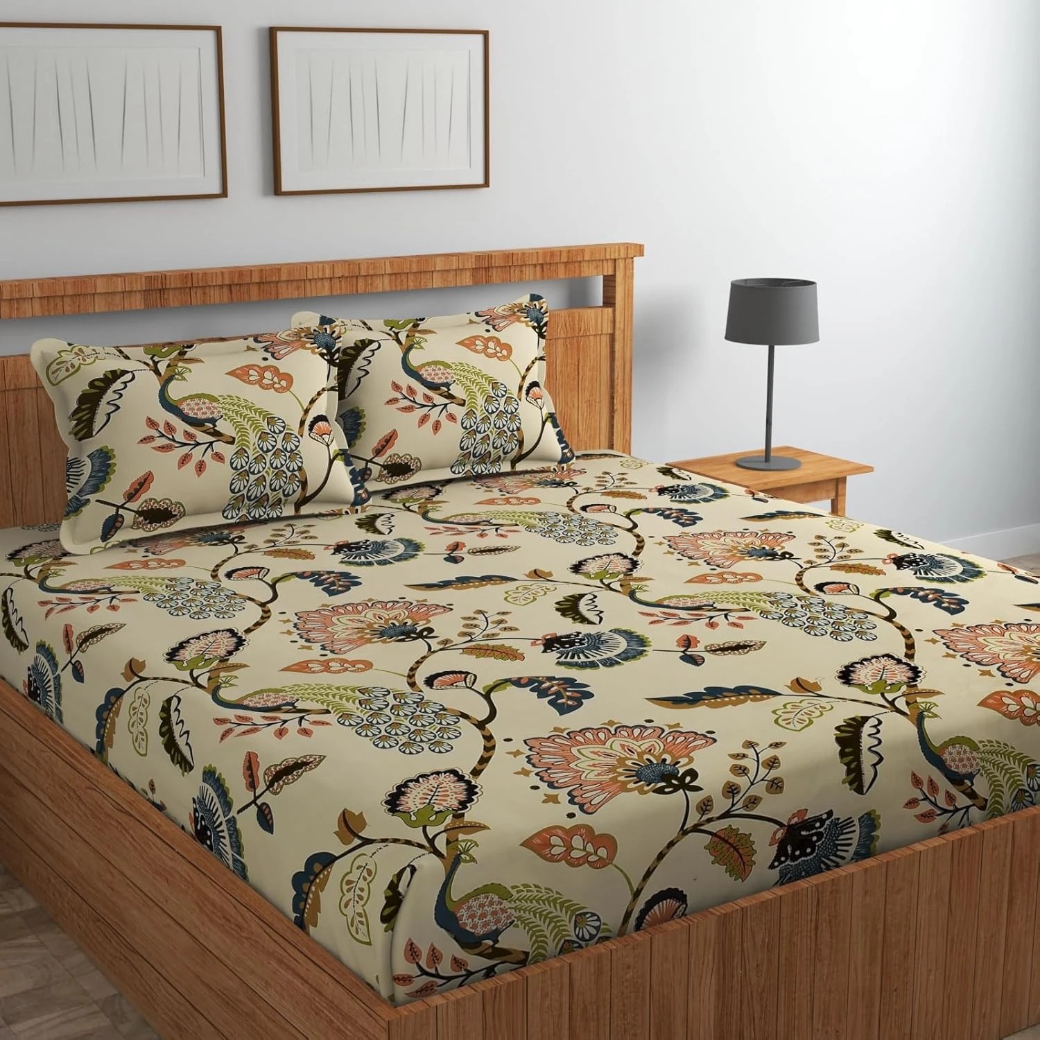 280 TC Cotton Feel All Around Elastic Fitted Bedsheets, Elastic Fitted Bedsheets King Size Bedsheet for Double Bed with 2 Pillow Covers, Size - 72 x 78 x 8 Inches, (Cream Floral)
