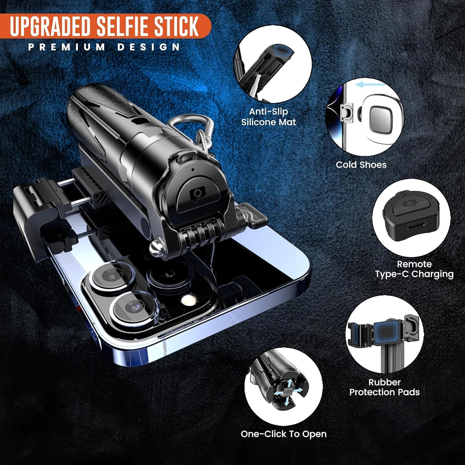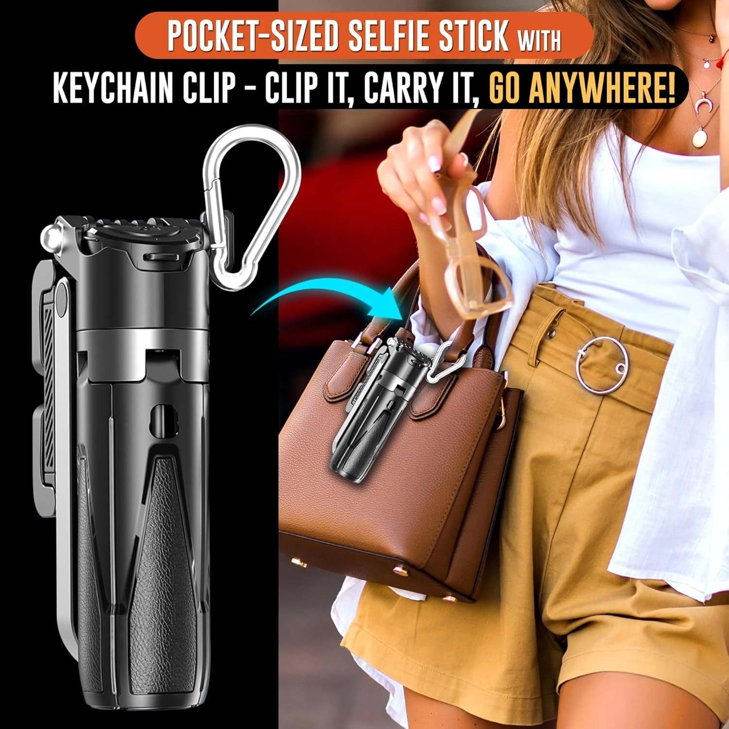 4 in 1 Mini Selfie Stick for Mobile, Tripod Stand with One-Click Auto OpenLegs, Premium Aluminum Build 5Section Telescopic Pole, 360°Rotation,Rechargeable Remote, Pocket-size for Travel