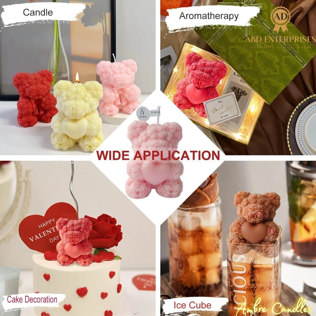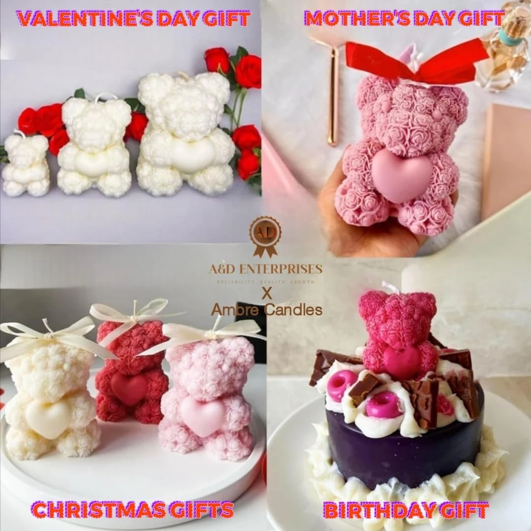 Ambre Candle Handmade Teddy Bear Soy Wax Candle, Rose-Textured, Heart Design, Aromatherapy, Decorative Gift, 40mm Height, 50g Pack of 2 (Red, Blue)