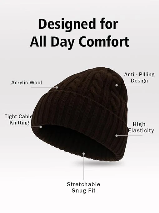 Beanie Cap for Men & Women,Woolen Winter Cap,Unisex Warm Cable Knitted Cap for Men & Women Color Solid Black