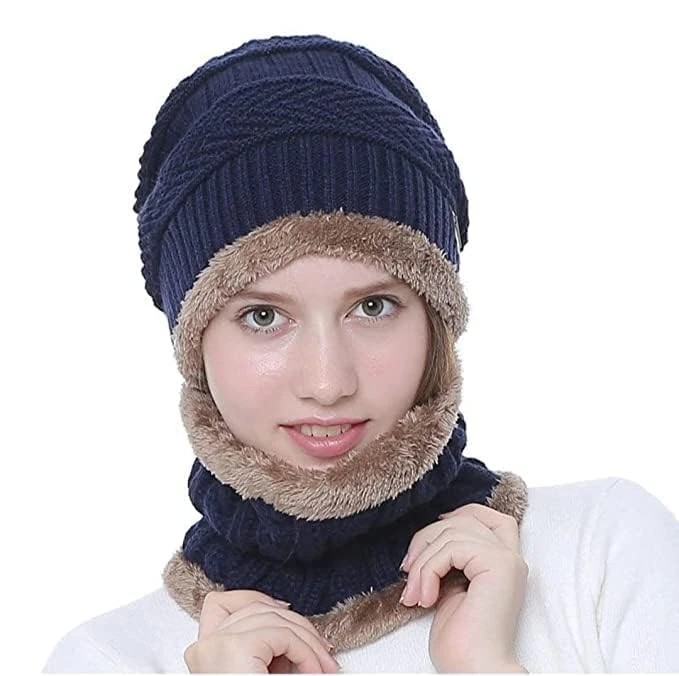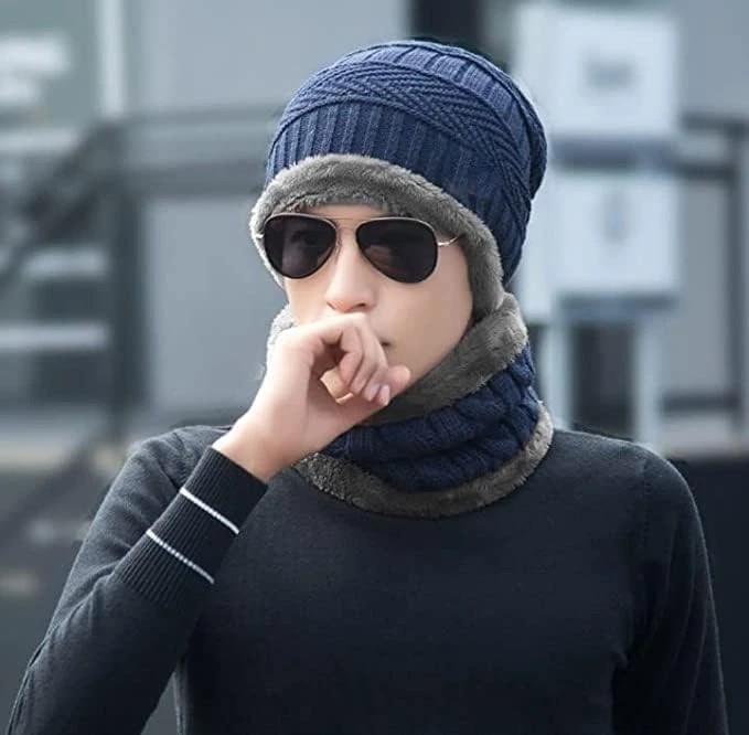 Beanie Cap & Muffler for Men & Women| Beanie Cap| Woolen Topaa| Winter Cap| Head & Neck Warmer| Blue Color| 1 Set|
