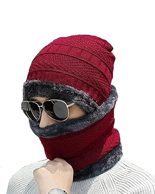 Beanie Cap & Muffler for Men & Women| Beanie Cap| Woolen Topaa| Winter Cap| Head & Neck Warmer| Maroon Color| 1 Set | Pack of 1