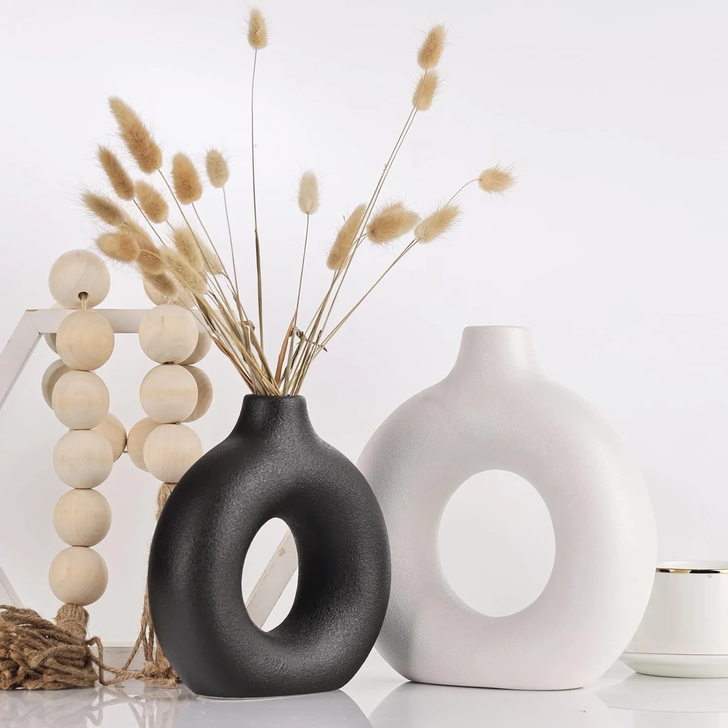 Ceramic Donut Vase | Round Hollow Centerpiece | Minimalist Flower Vase for Pampas Grass & Table Showpiece | Ideal for Living Room, Home, Shelf & Office Decor (Black & White, 7 & 9 inch) Pack of 2