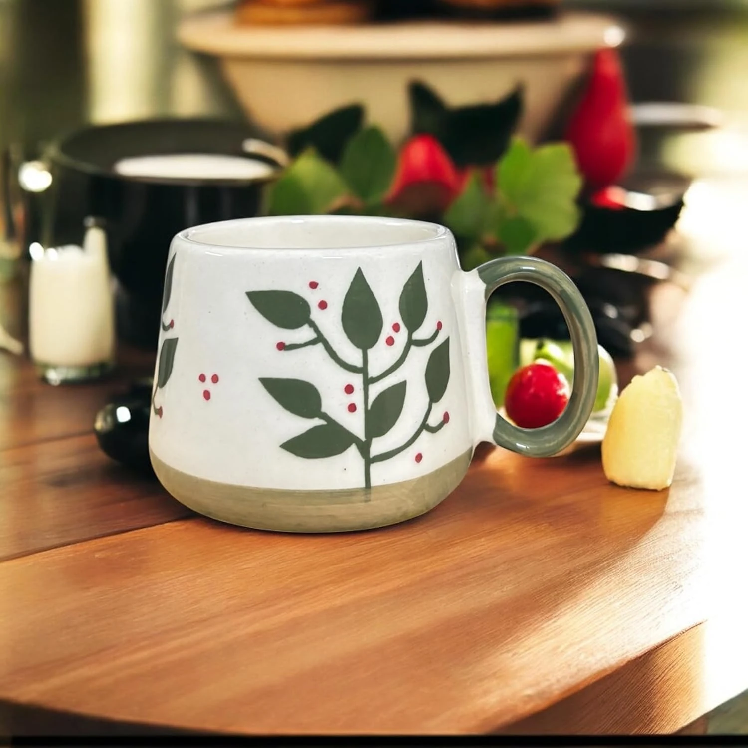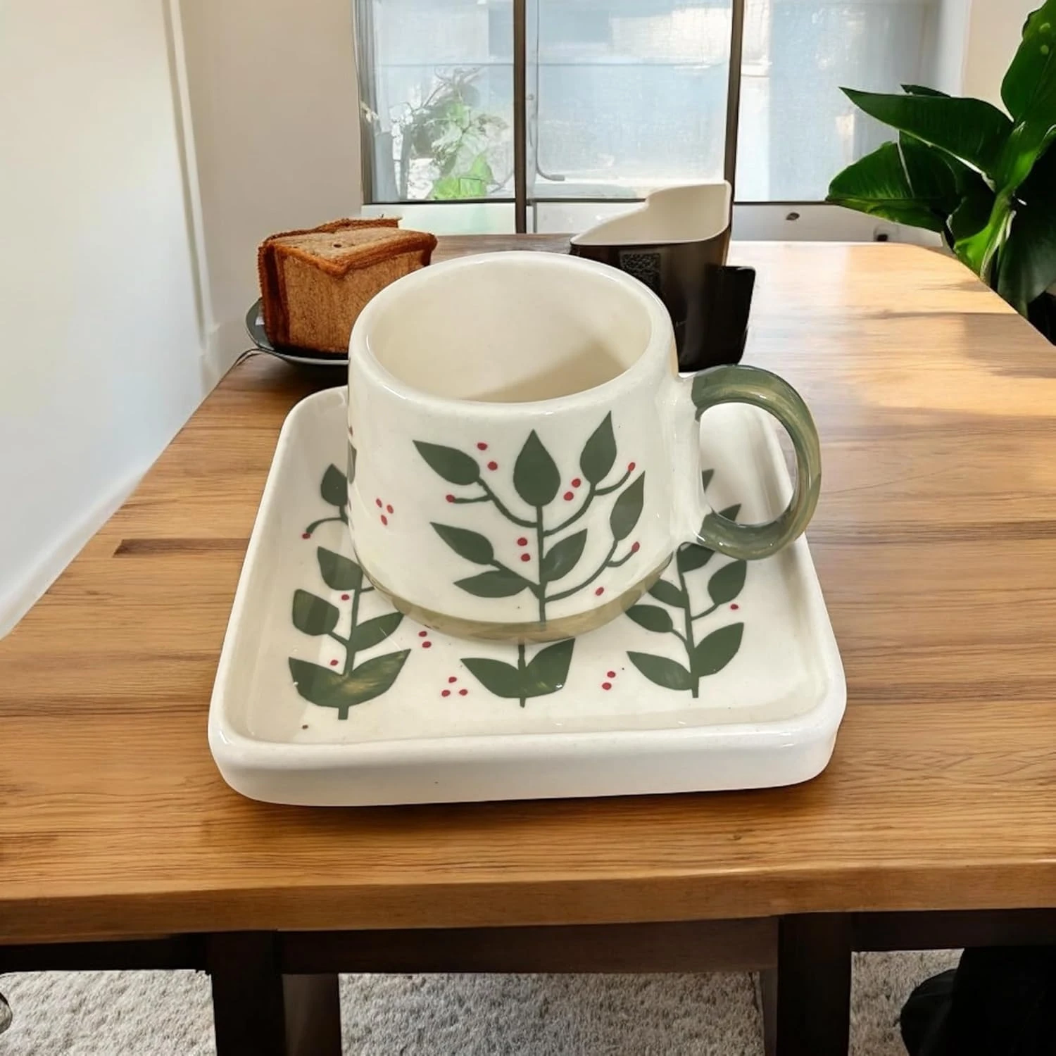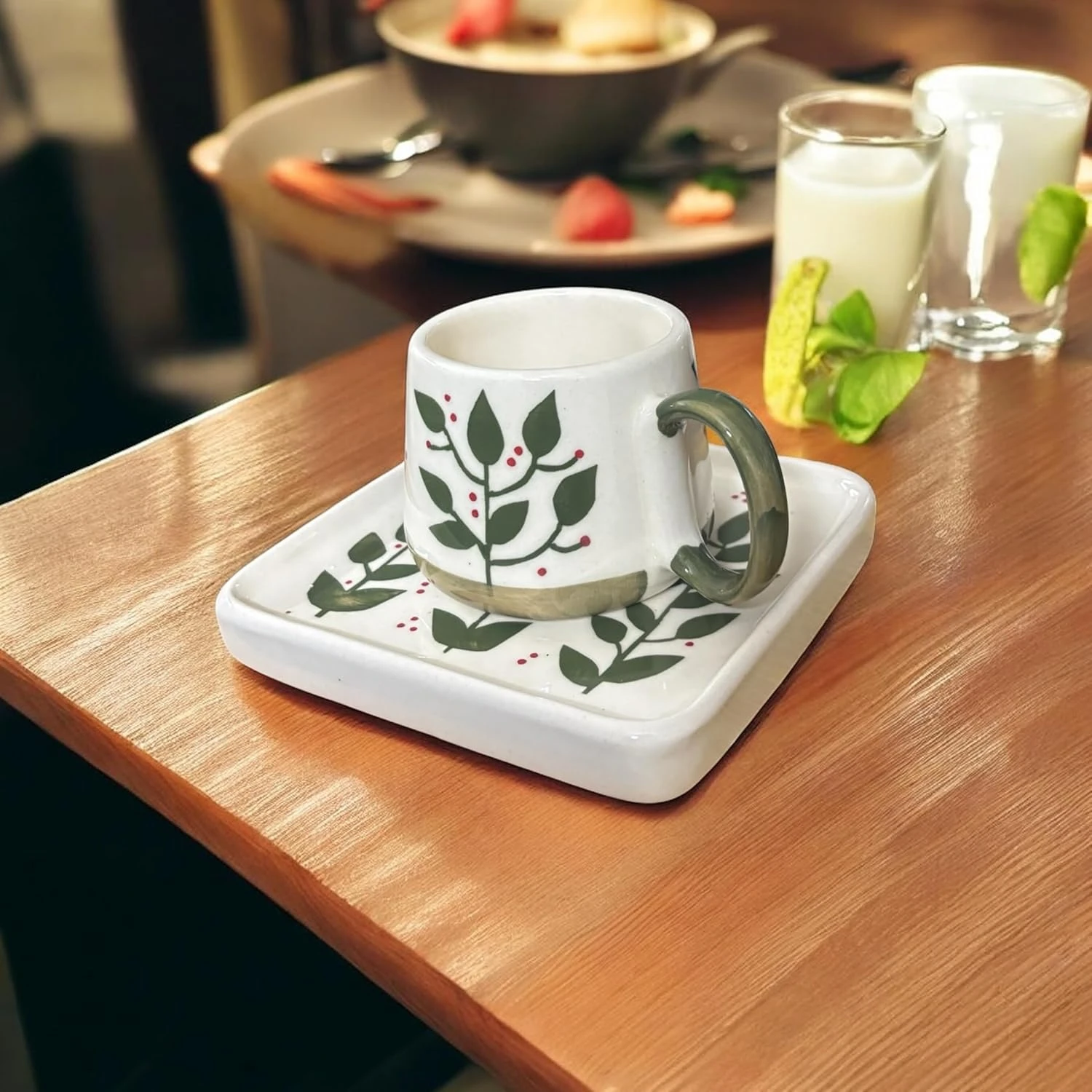 Ceramic Tea Cup and Saucer Set with Green Leaf Pattern, White
