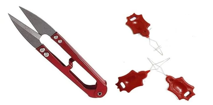 Combo Pack of Metal Sewing Snips Thread Cutter Scissors (1) + Needle Threader Plastic Wire Loop DIY Hand Machine Sewing Tool (3) | Random Colors