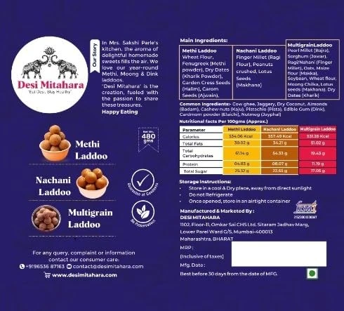• Includes Methi (Fenugreek), Nachani (Ragi), and Multigrain Ladoos: Each ladoo is crafted using its core ingredients—fenugreek powder, ragi flour, and a blend of grains—to offer distinct flavors and textures.