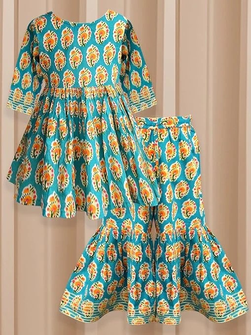 Girls Poly Silk Floral Printed 3/4 Sleeve Sharara Set | Traditional Ethnic Wear Clothing Set for Festival and Special Occasions Size Age 11-12 Year Color Blue